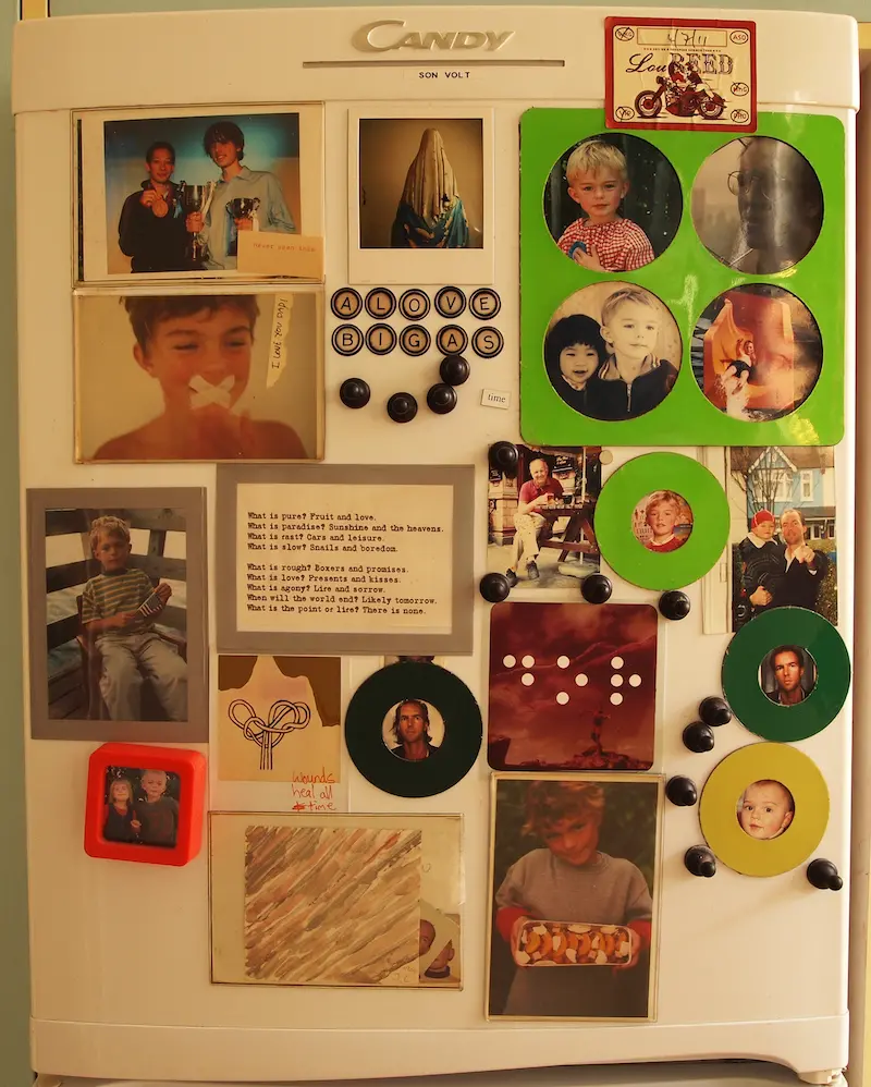 "Although not crammed with pictures of smiling relatives, this fridge is a pretty fair reflection of my small family. Not just my son's changing faces but a fragment of his poetry as well – words can be more authentic than a photograph sometimes. My father (who died suddenly while visiting me in London) always watching over me, his face beside the grandson he never met."