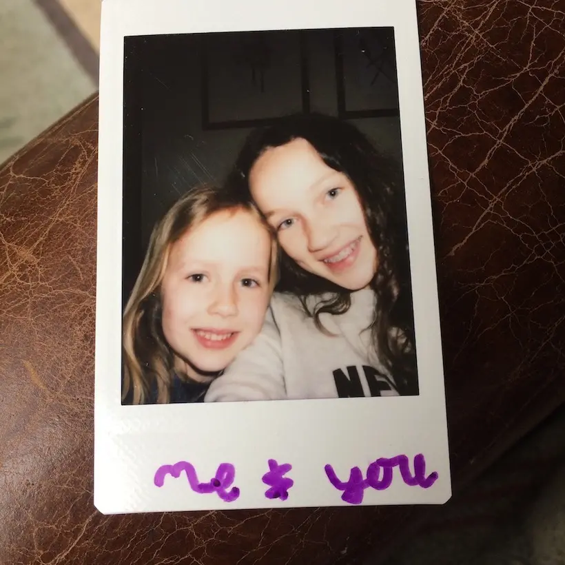 "Found this buried in a pile of papers – an instamatic selfie of oldest and youngest daughters touchingly labeled by youngest who adores of both her older sisters."