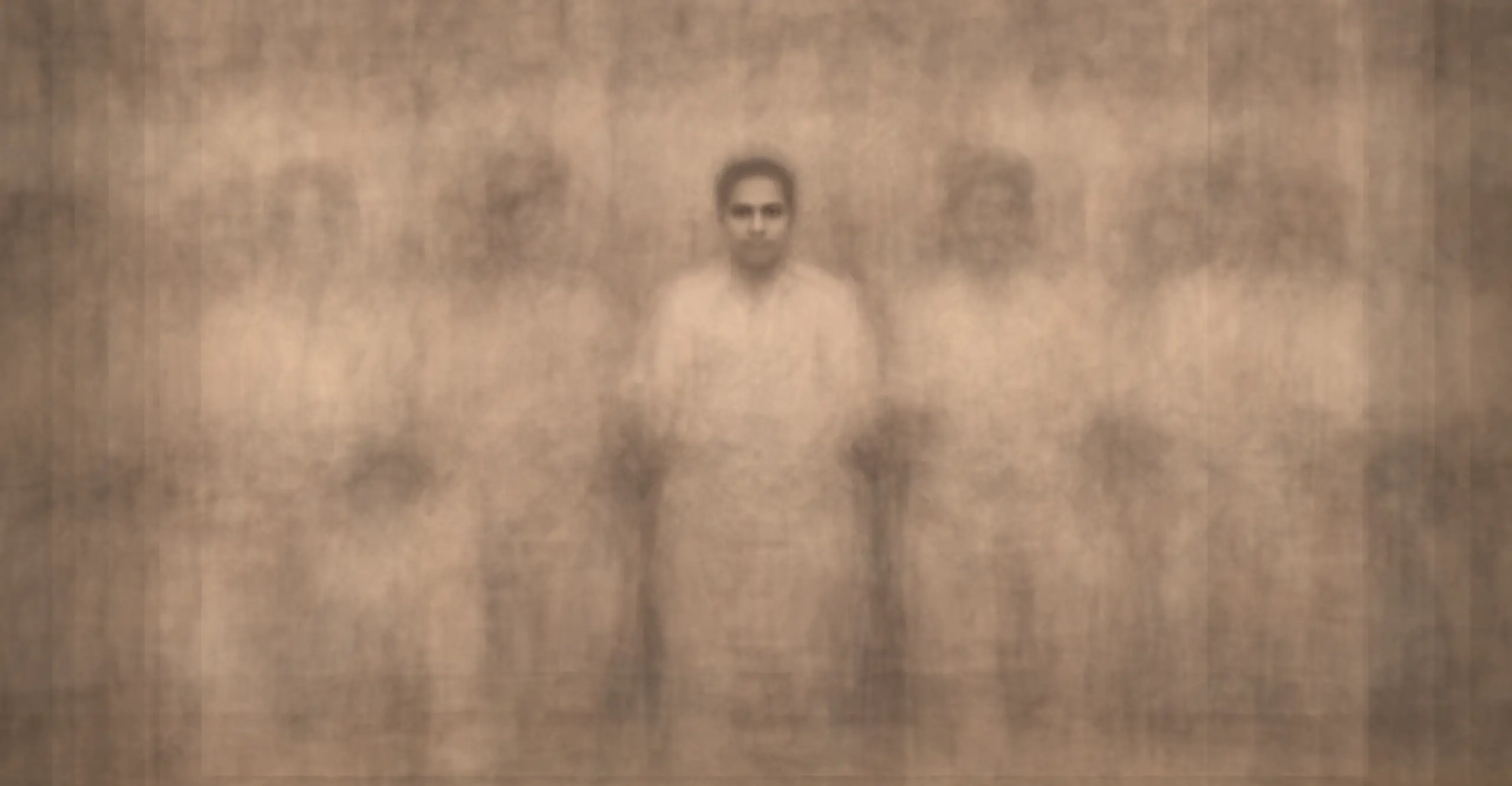 A composite of several sepia close-up photographs of a group of people posing in a South Asian photo studio. The image is ghostly other than the person in the centre's face.