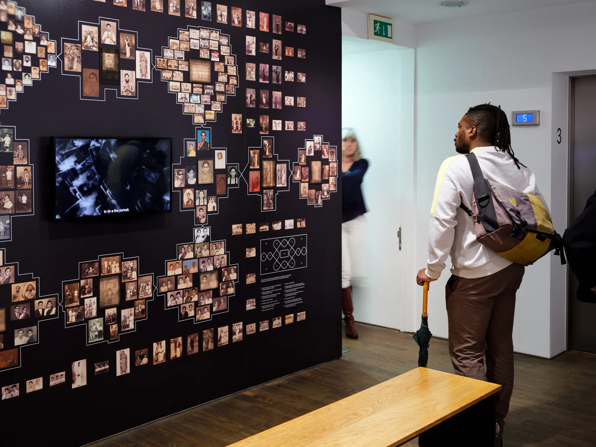 The installation takes the shape of a Kolam, where patterns are traditionally drawn with rice flour by women on their home entrance to welcome all but the evil spirits. In this case, the kolam is formed by groupings of photographs organised on a grid by an image classification algorithm, and assembled on clusters by Akkapeddi’s own artistic intervention. Each group is represented by a central image, a composite averaging all of the images within the cluster. A new digital interactive extension of the work invites visitors to pull apart the composites and learn about the source and cultural insights of each photograph.