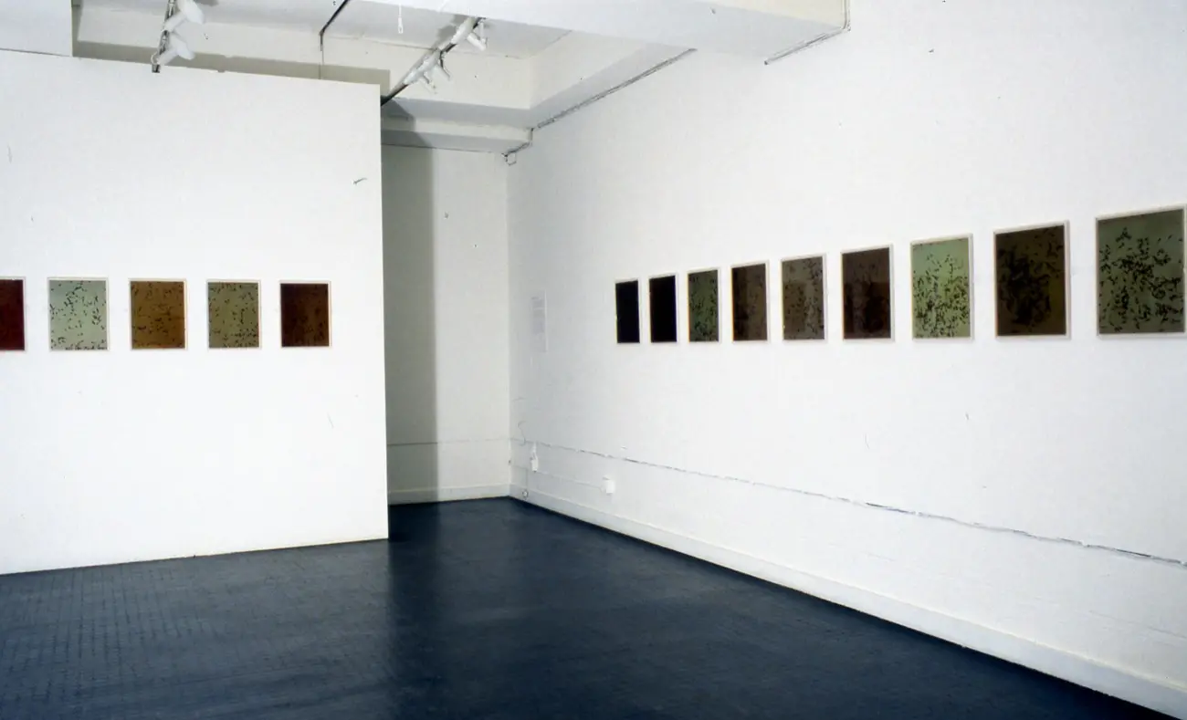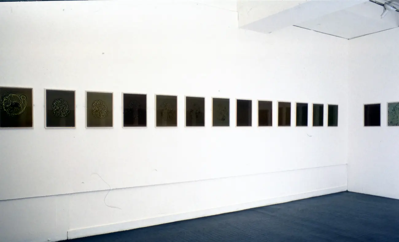 Susan Derges's Full Circle deals with metamorphosis; through a series of thirty six richly coloured prints, it follows the transformation of a cluster of frog spawn, from tadpoles to fully formed frogs. The process resembles a controlled experiment and the work appears to belong as much to the laboratory as to the artist's studio. It suggests a metaphor for the wider conditions of nature - its pattern of expansion and growth reverberating throughout our world.