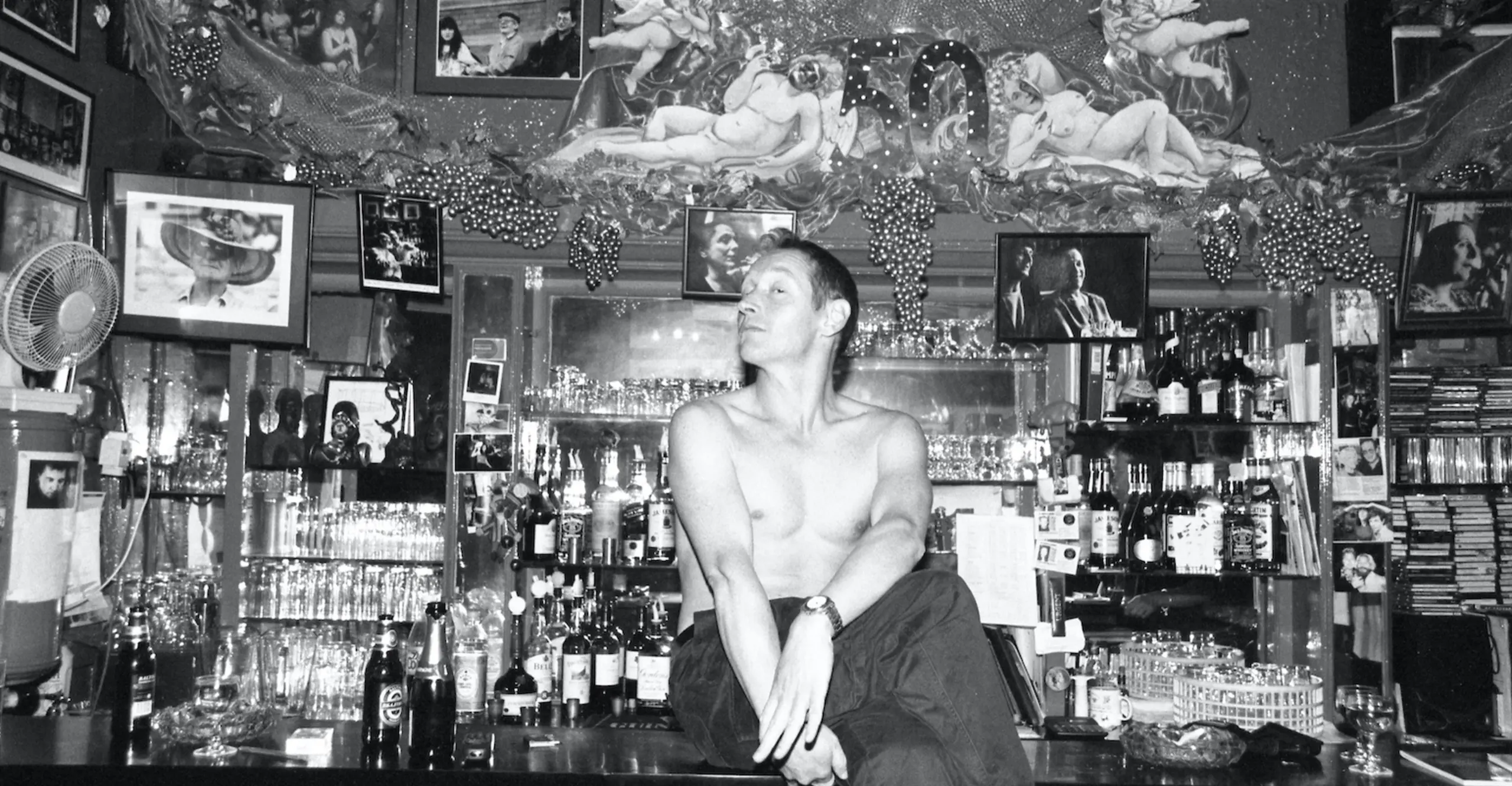 For a legally licenced premises there was an awful lot of nudity at the Colony. I shot 100m rolls of black and white film there and sat on them for a long time. When I got round to looking at them properly and scanning and printing from them I was surprised at how much naked flesh was on view. It wasn’t because there was much sex going on there - I remember one member telling me that ruefully that “erections weren’t my forte” – more just a lot of showing off. I love this shot of Peter Quinn Davis preening shirtless on the bar. The Colony Room had a well-deserved reputation for being quite a scary place. What I like best about these pictures is that it shows there was also a lot of tenderness in that room – a kind of gleeful innocence.