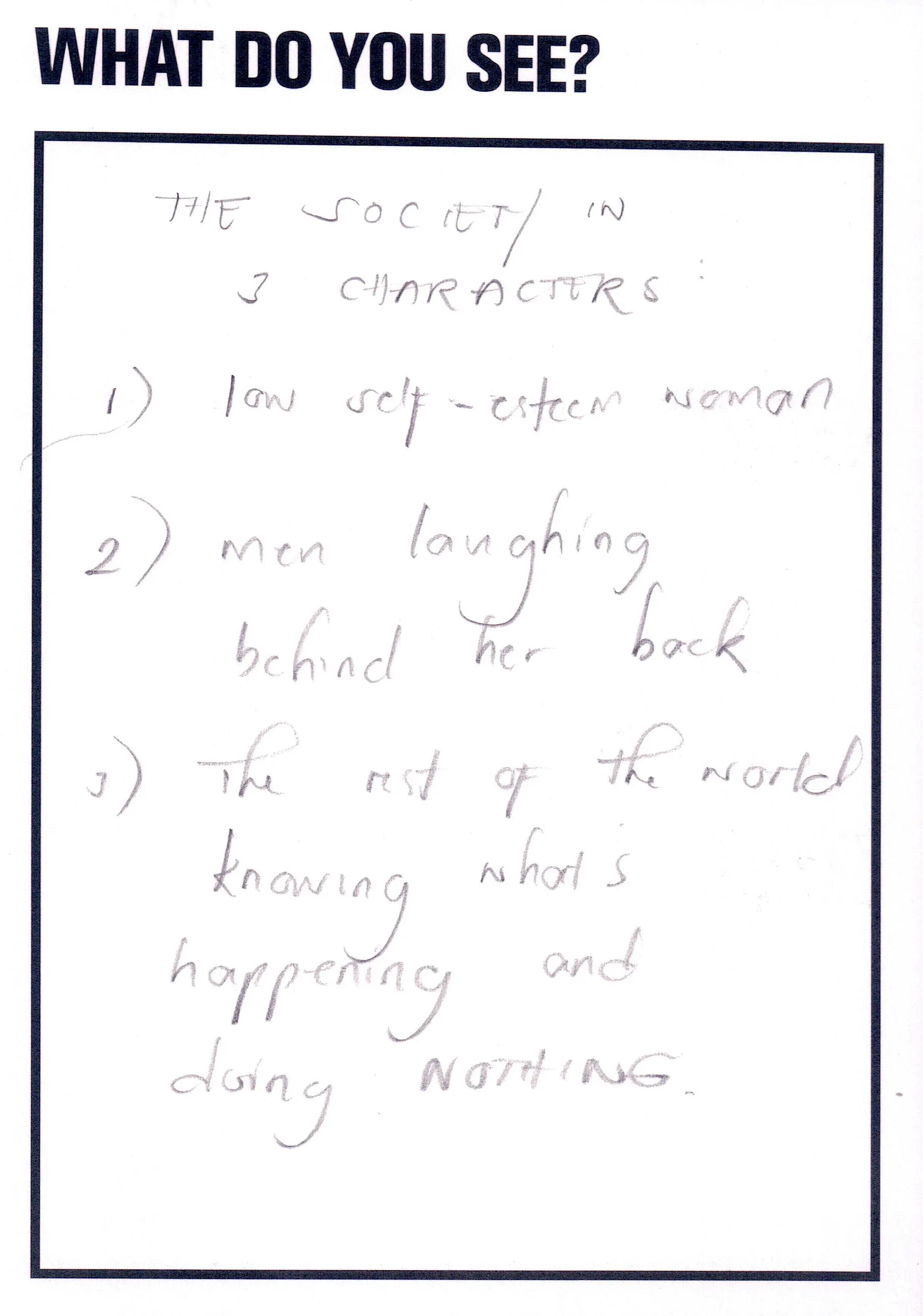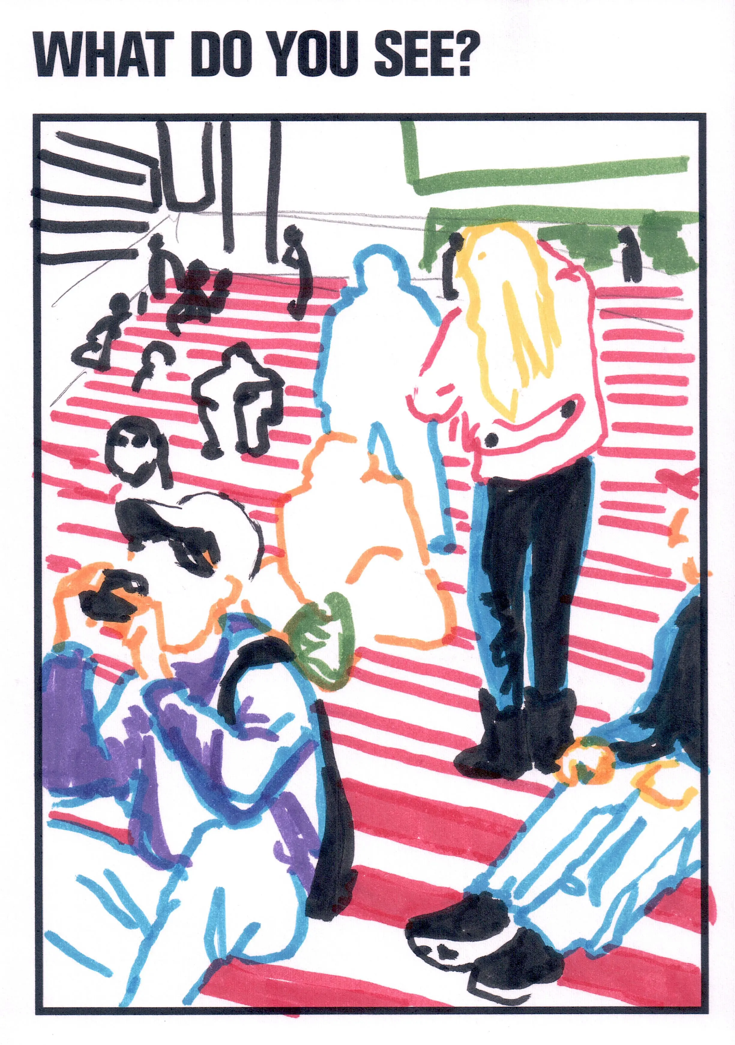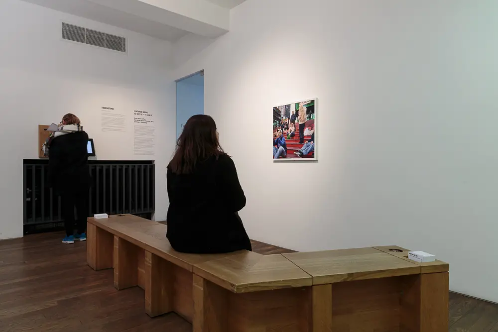 The photograph featured as part of the Touchstone programme (2012-2020). Each display consisted of a single photographic work on the Eranda studio floor where visitors were invited to respond to the question 'What do you see?' using the cards and pencils provided. A bench was placed in front of the work, encouraging people to spend a little longer than they might usually. The programme was part of a wider series of projects and activities related to visual literacy.