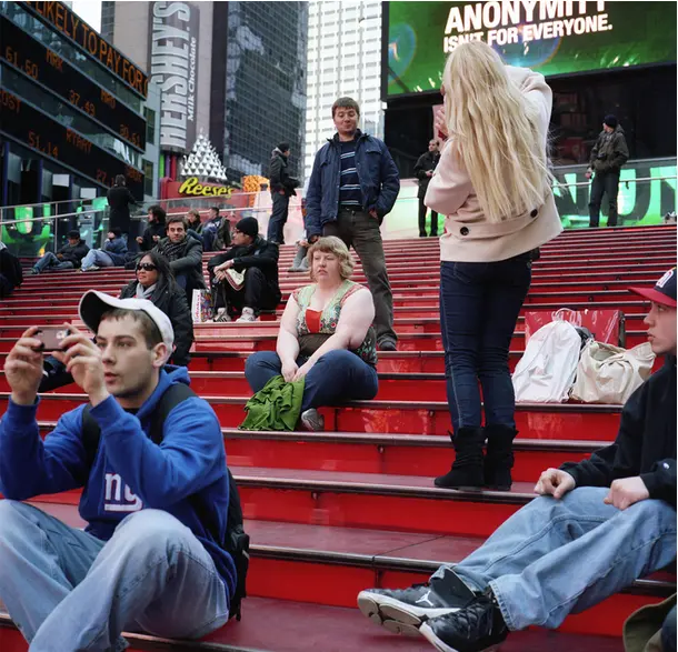 This photograph is from a series called The Watchers. Morris-Cafiero produced a range of self portraits in busy public places. Here she is seen sitting on the stairs in Times Square, New York City. Mounting her camera on a tripod or bench, the artist used a timer to take self portraits while doing everyday tasks such as resting, reading a map, talking on the phone or stopping to take a photograph.
