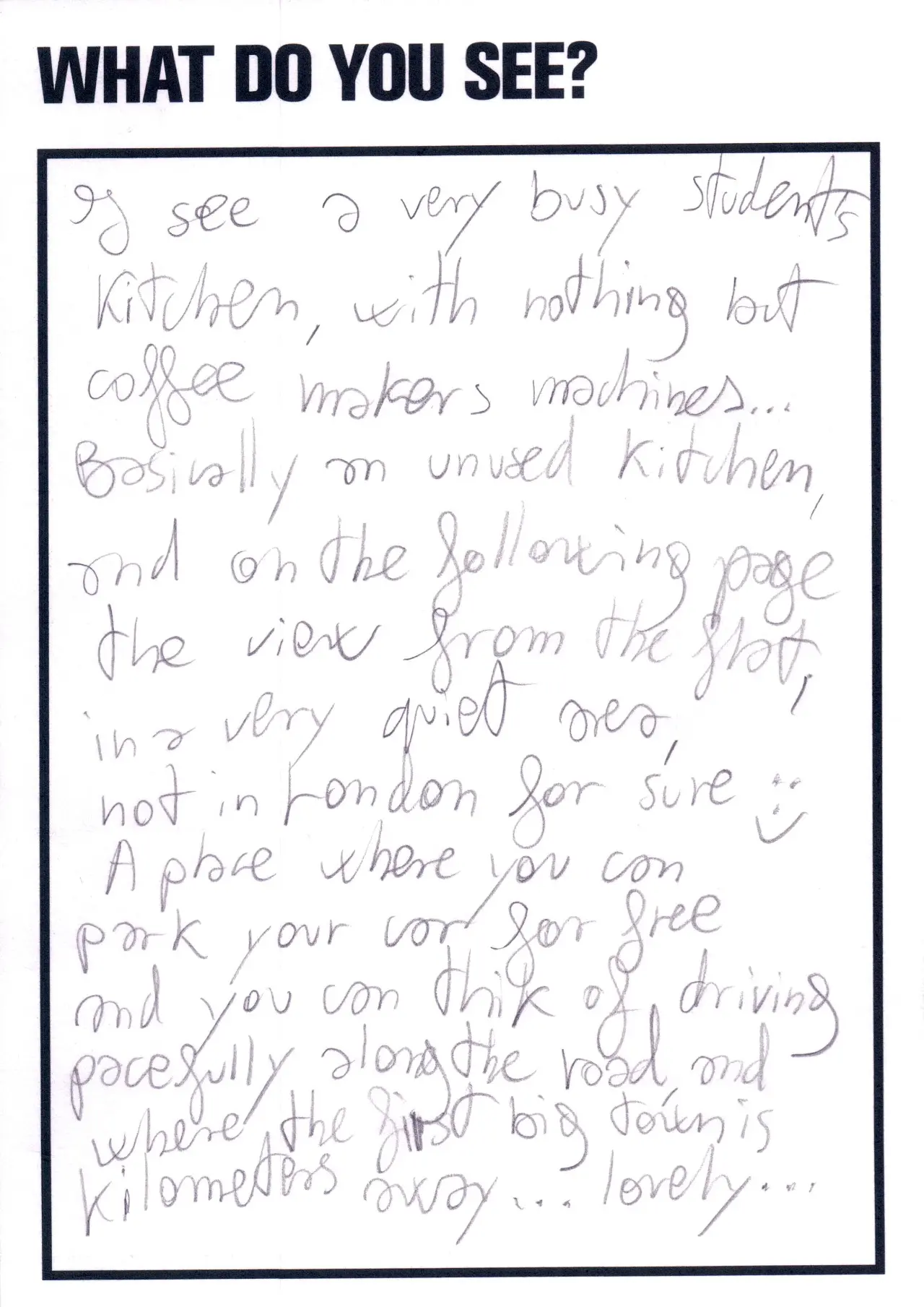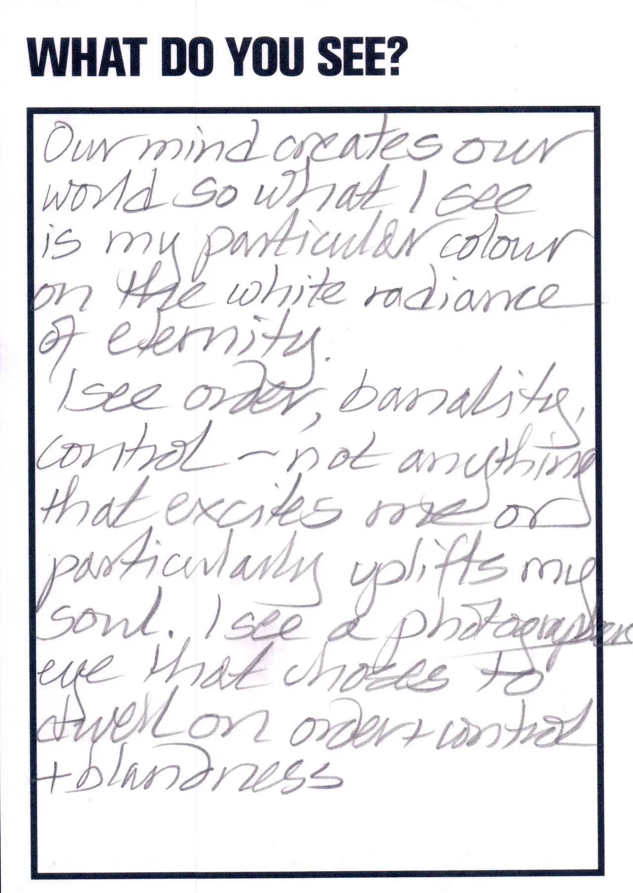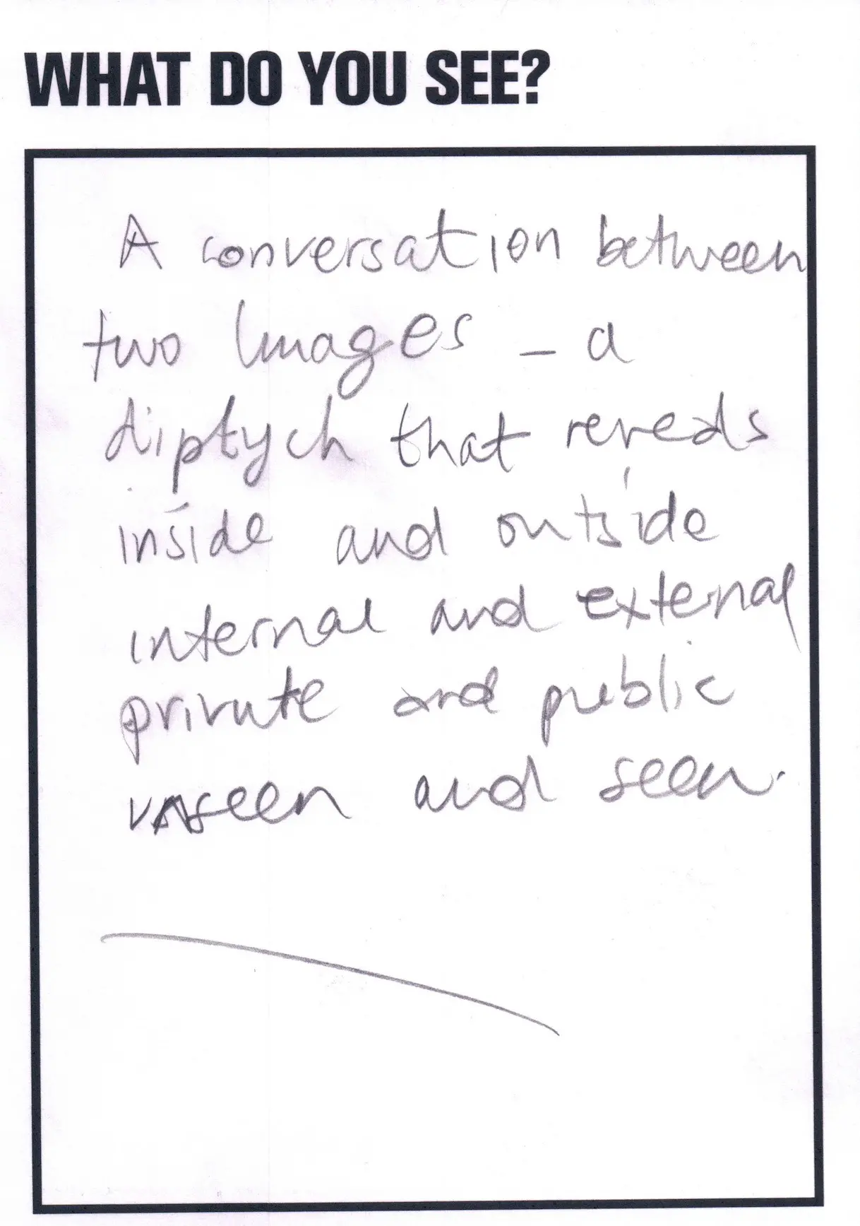 The open book featured as part of the Touchstone programme (2012-2020). Each display consisted of a single photographic work on the Eranda studio floor where visitors were invited to respond to the question 'What do you see?' using the cards and pencils provided. A bench was placed in front of the work, encouraging people to spend a little longer than they might usually. The programme was part of a wider series of projects and activities related to visual literacy.