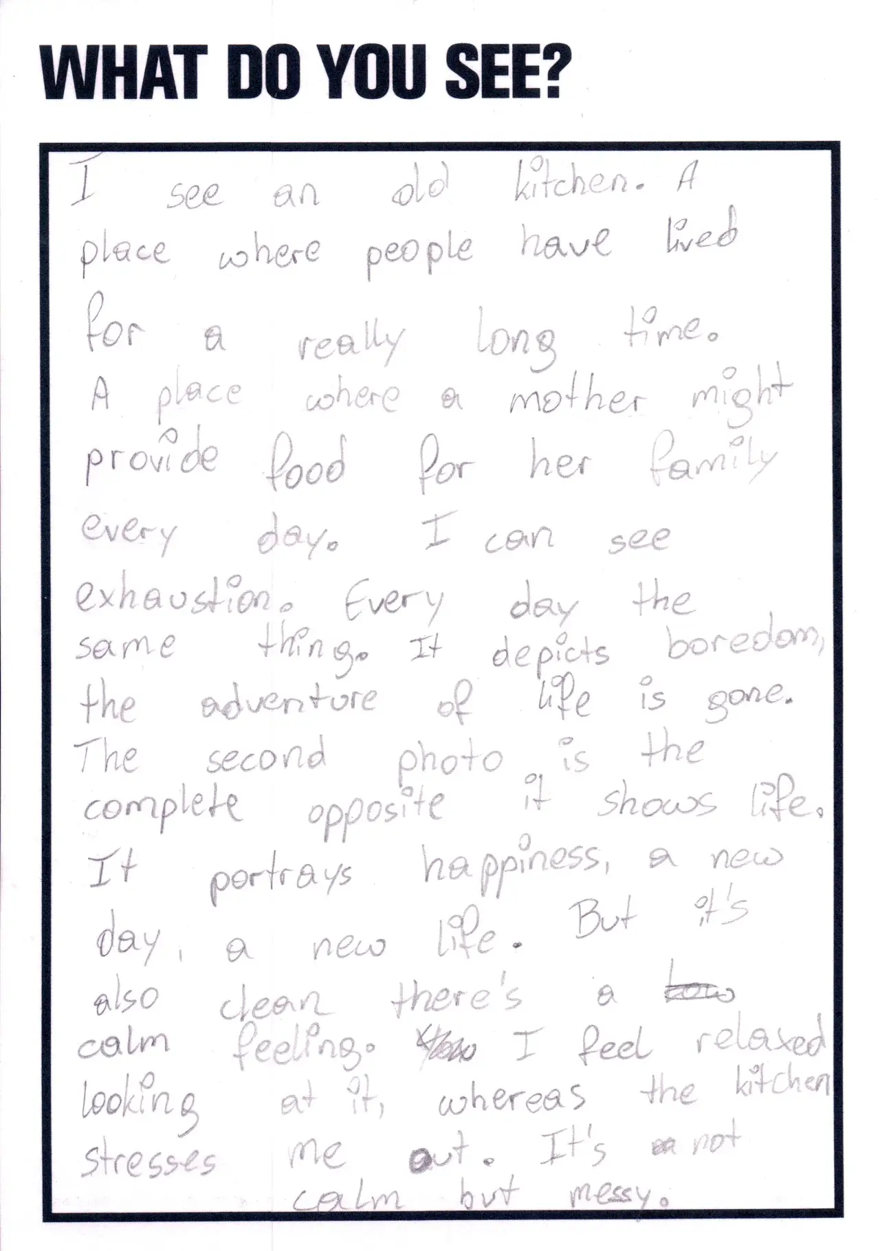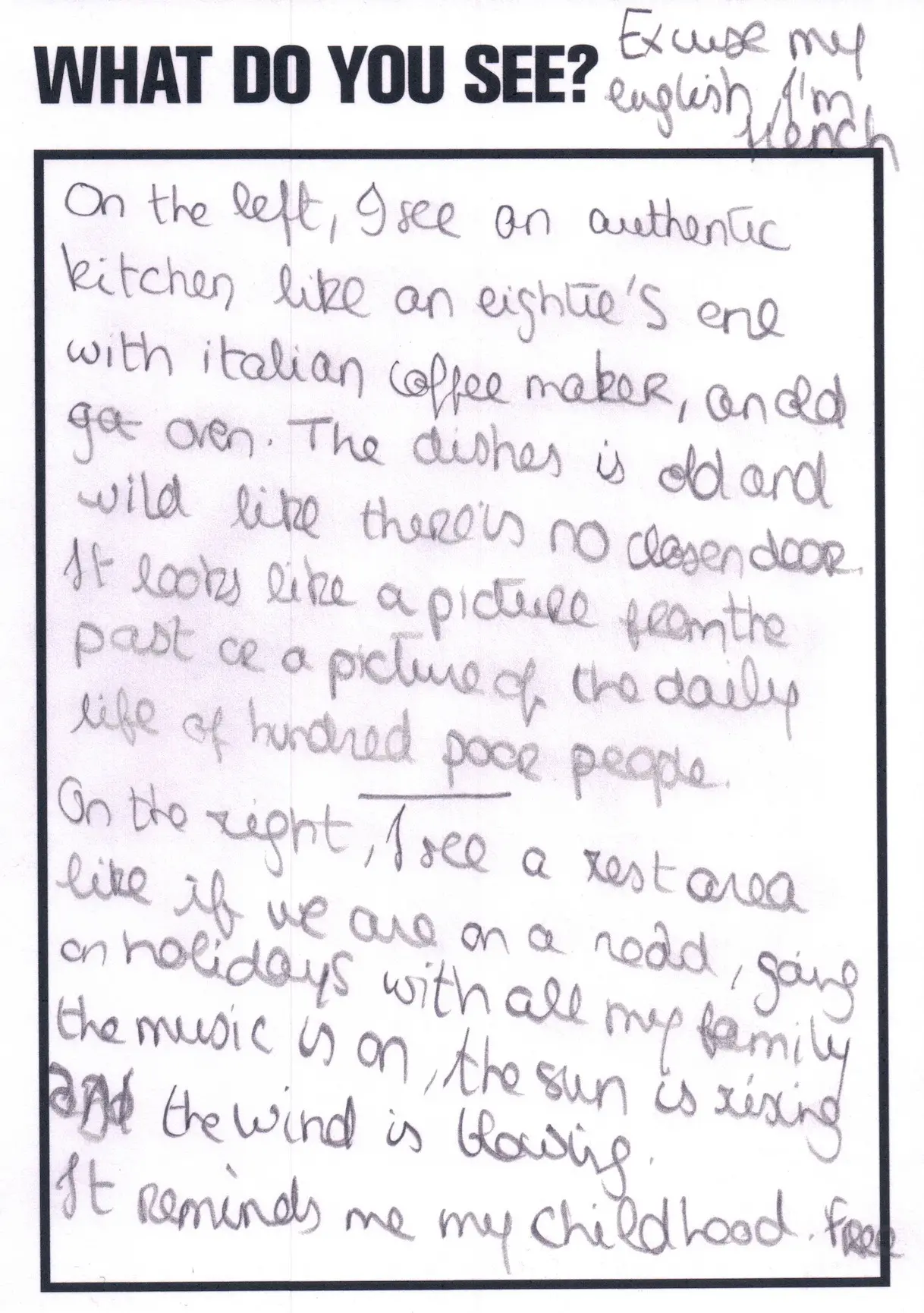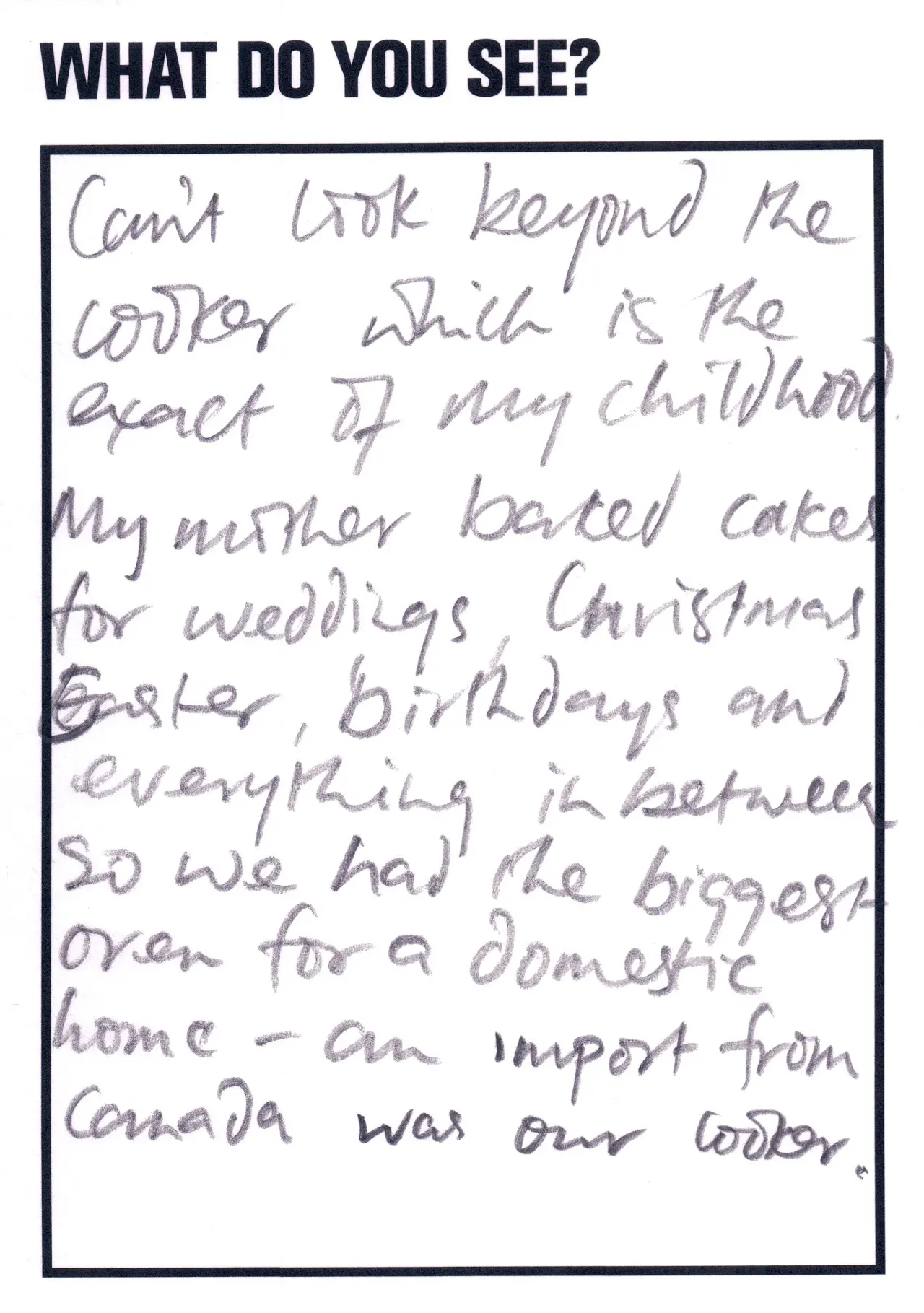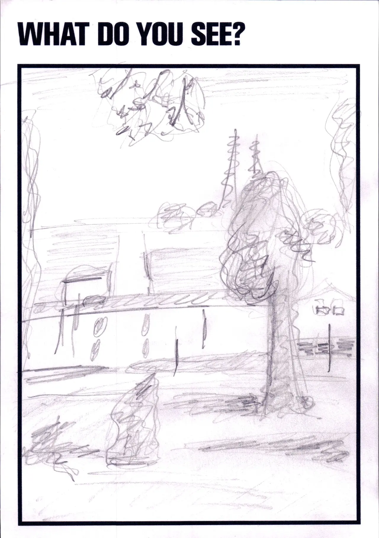 The open book featured as part of the Touchstone programme (2012-2020). Each display consisted of a single photographic work on the Eranda studio floor where visitors were invited to respond to the question 'What do you see?' using the cards and pencils provided. A bench was placed in front of the work, encouraging people to spend a little longer than they might usually. The programme was part of a wider series of projects and activities related to visual literacy.