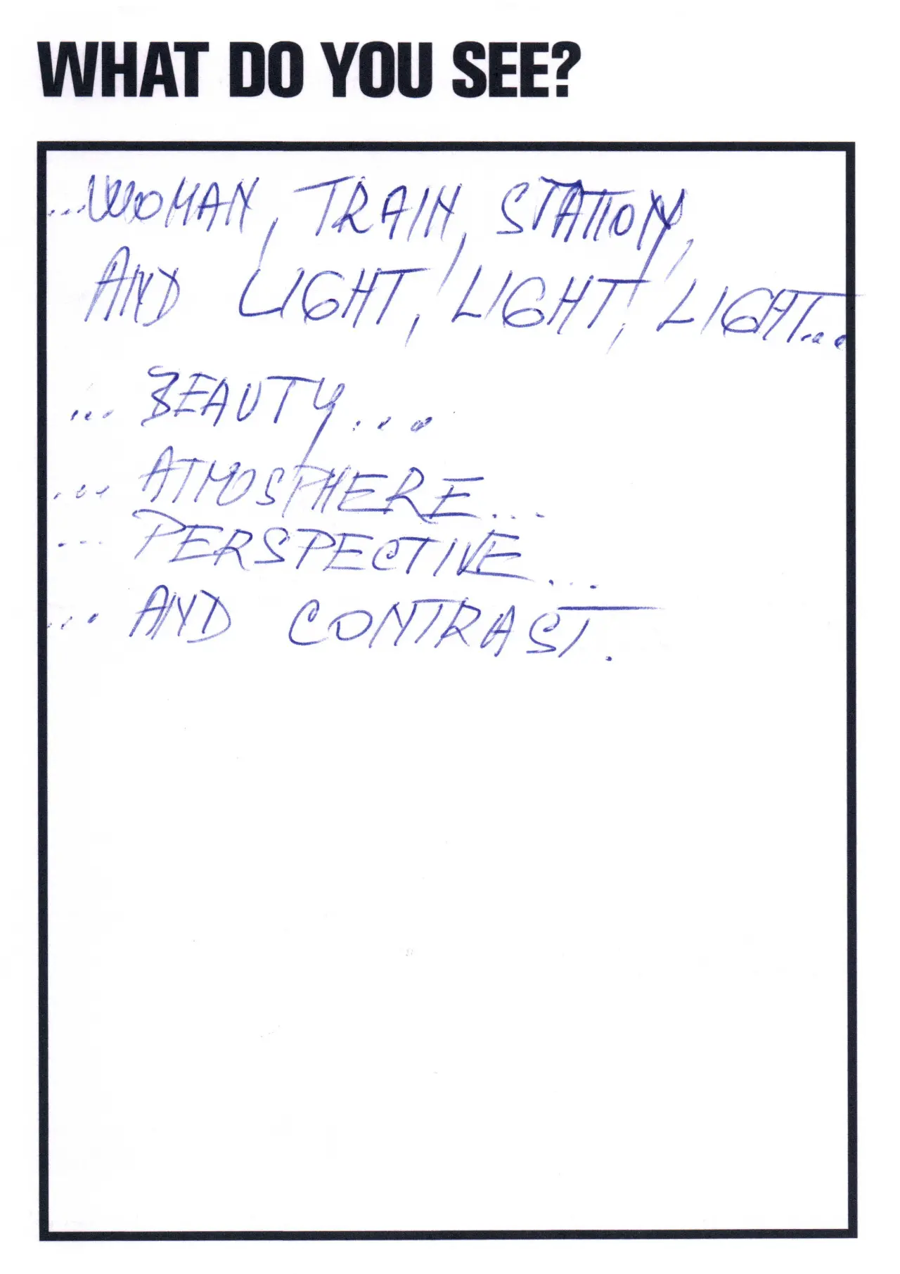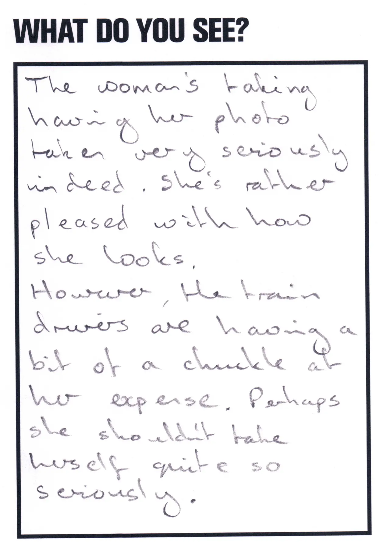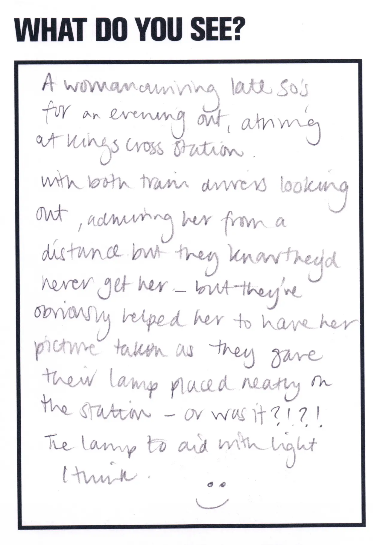 This photograph featured as part of the Touchstone programme (2012-2020). Each display consisted of a single photographic work on the Eranda studio floor where visitors were invited to respond to the question 'What do you see?' using the cards and pencils provided. A bench was placed in front of the work, encouraging people to spend a little longer than they might usually. The programme was part of a wider series of projects and activities related to visual literacy.