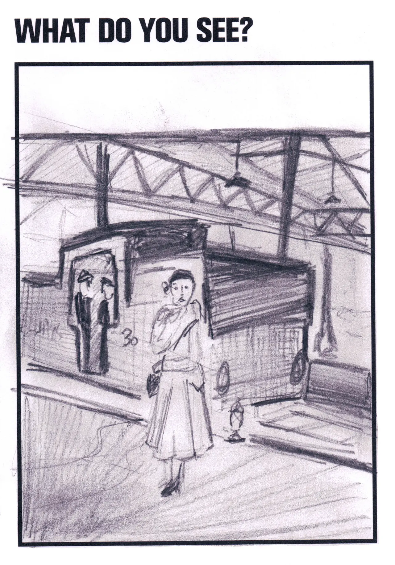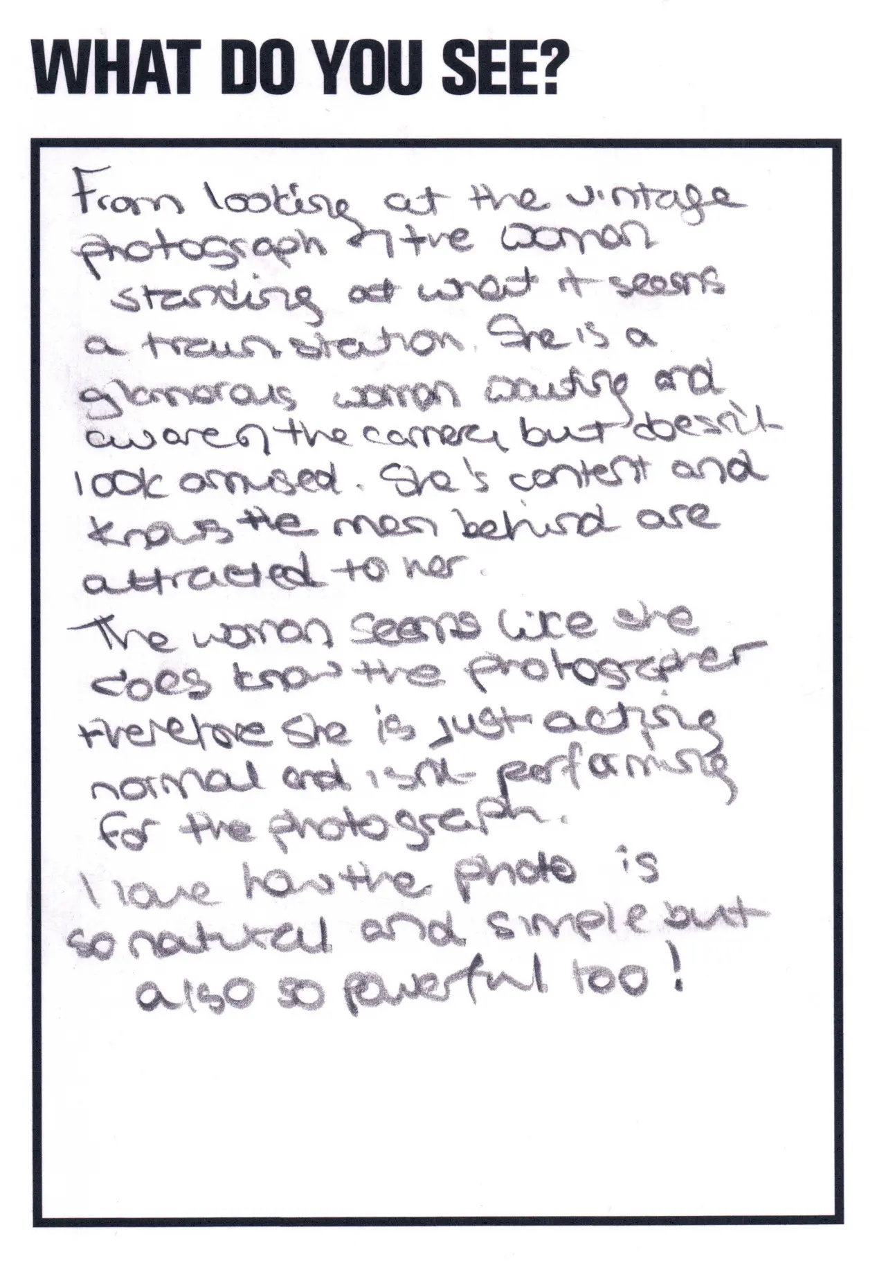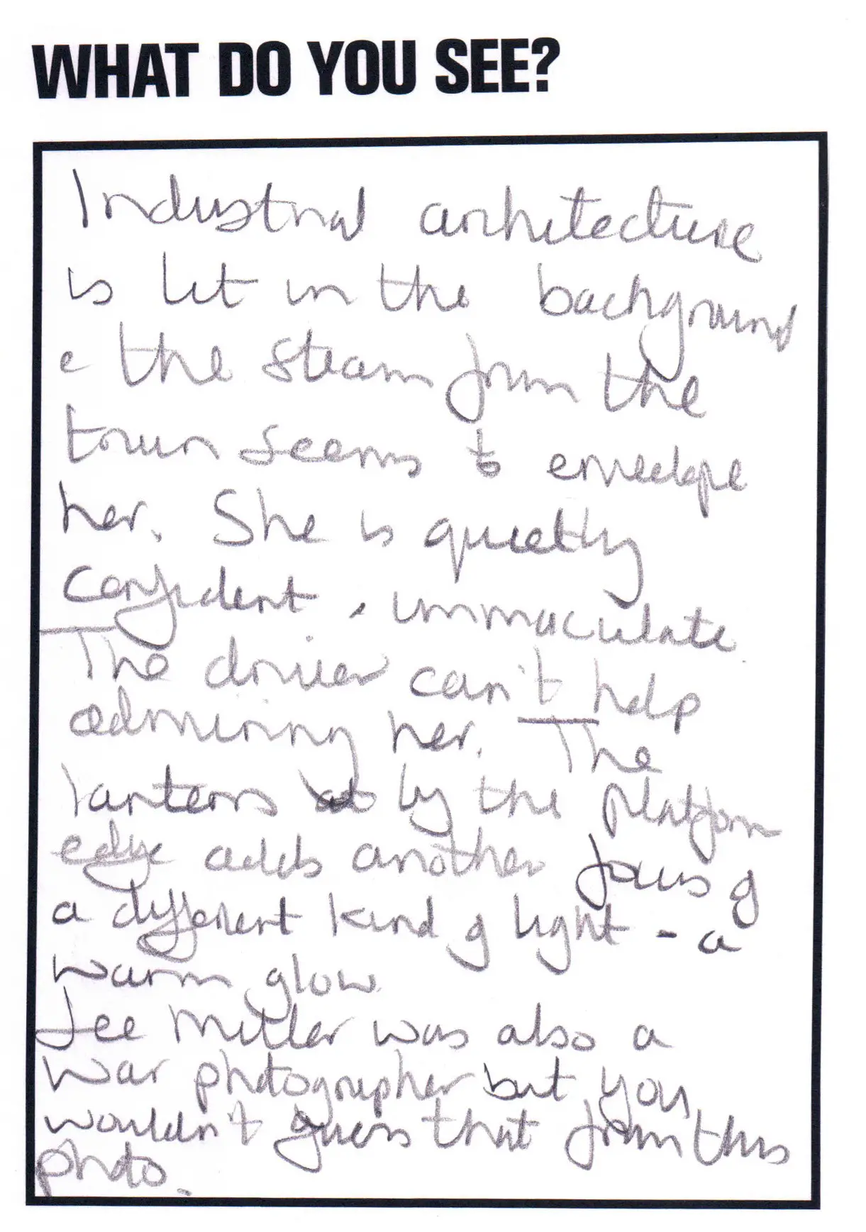 This photograph featured as part of the Touchstone programme (2012-2020). Each display consisted of a single photographic work on the Eranda studio floor where visitors were invited to respond to the question 'What do you see?' using the cards and pencils provided. A bench was placed in front of the work, encouraging people to spend a little longer than they might usually. The programme was part of a wider series of projects and activities related to visual literacy.