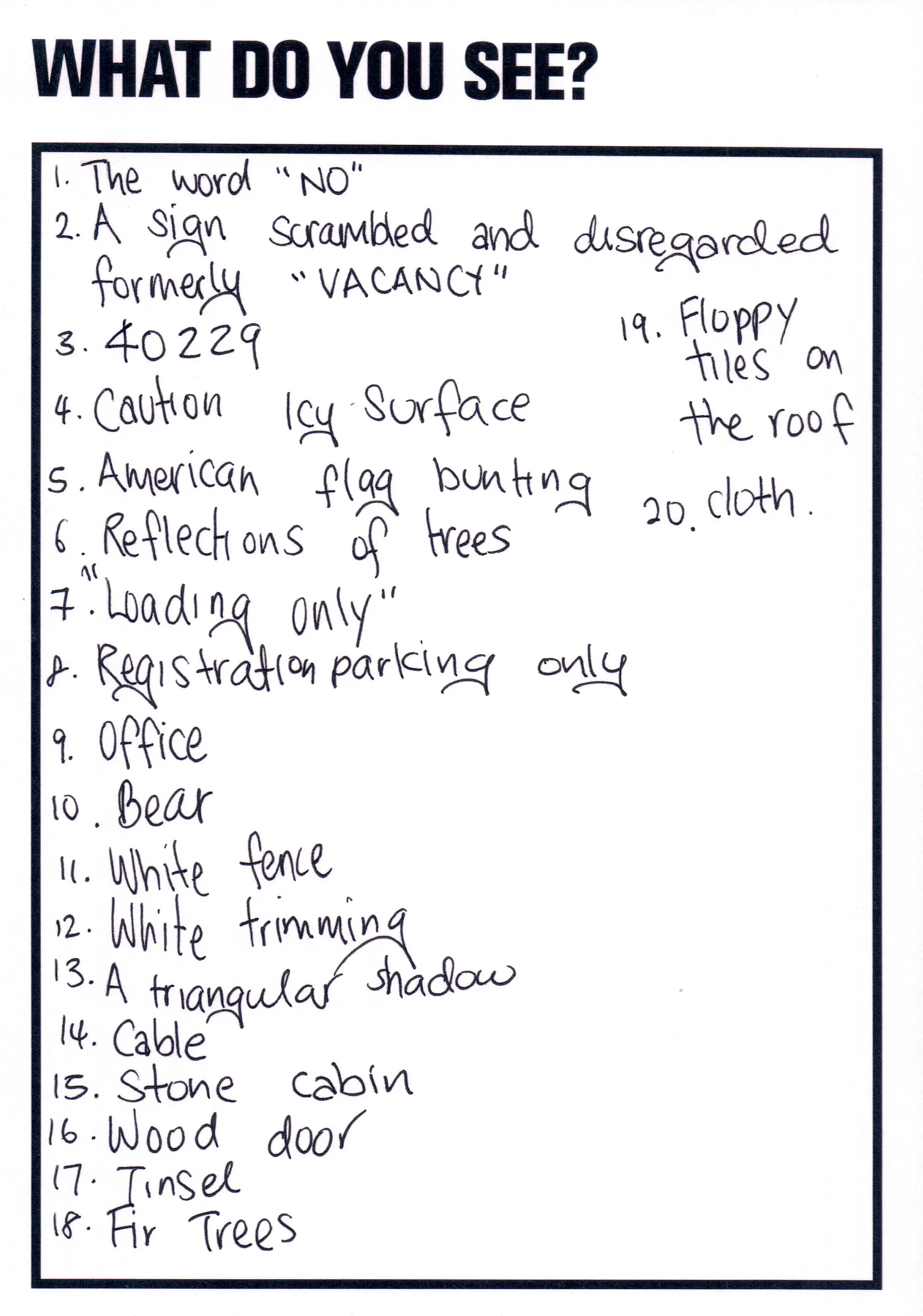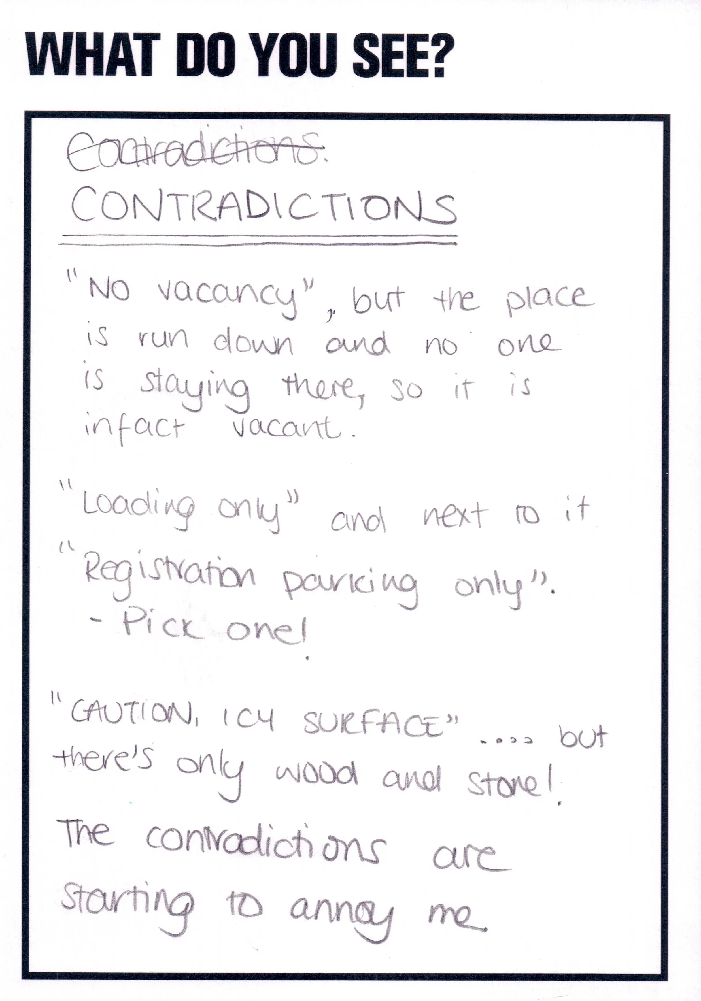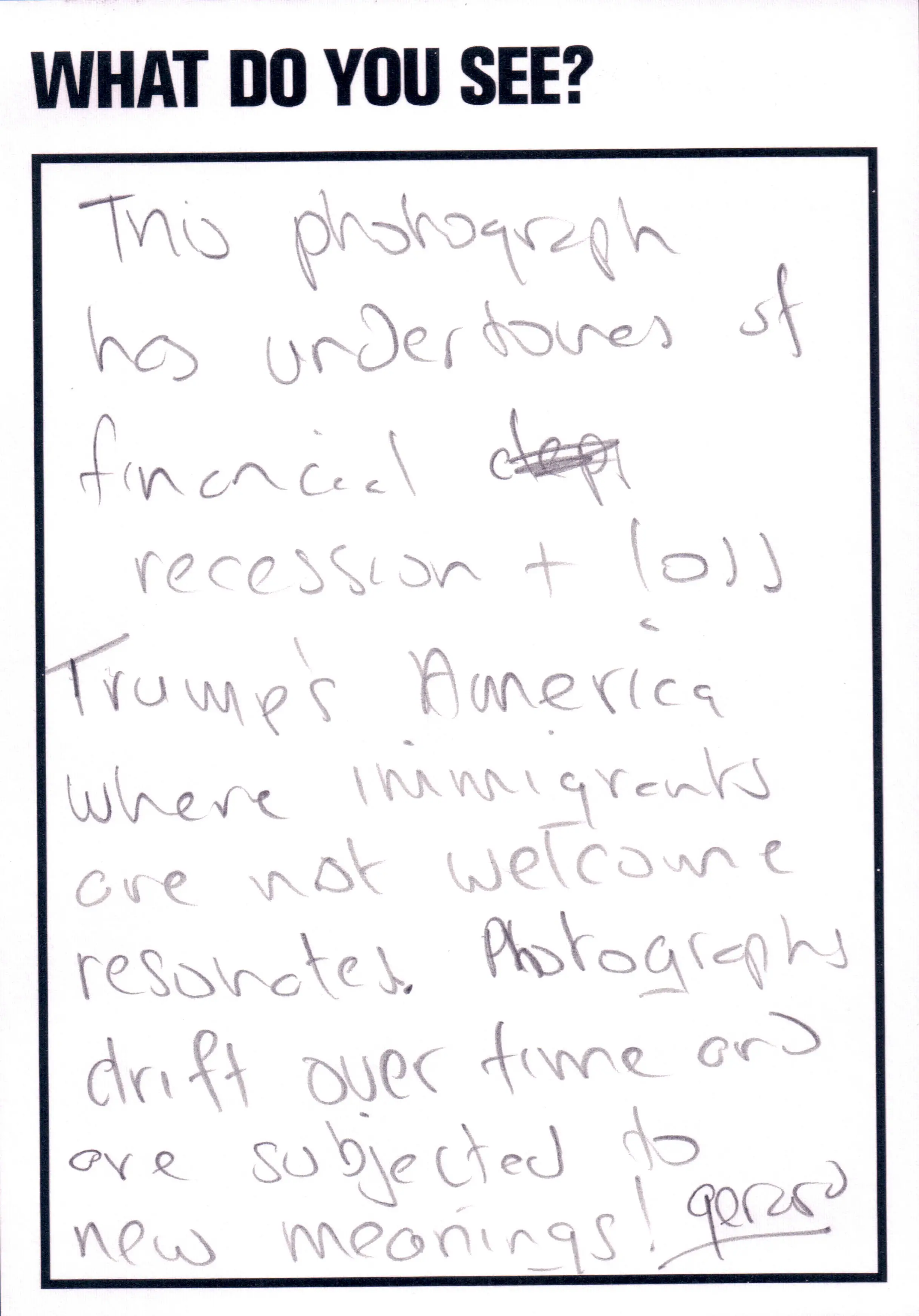 This artwork featured as part of the Touchstone programme (2012-2020). Each display consisted of a single photographic work on the Eranda studio floor where visitors were invited to respond to the question 'What do you see?' using the cards and pencils provided. A bench was placed in front of the work, encouraging people to spend a little longer than they might usually. The programme was part of a wider series of projects and activities related to visual literacy.