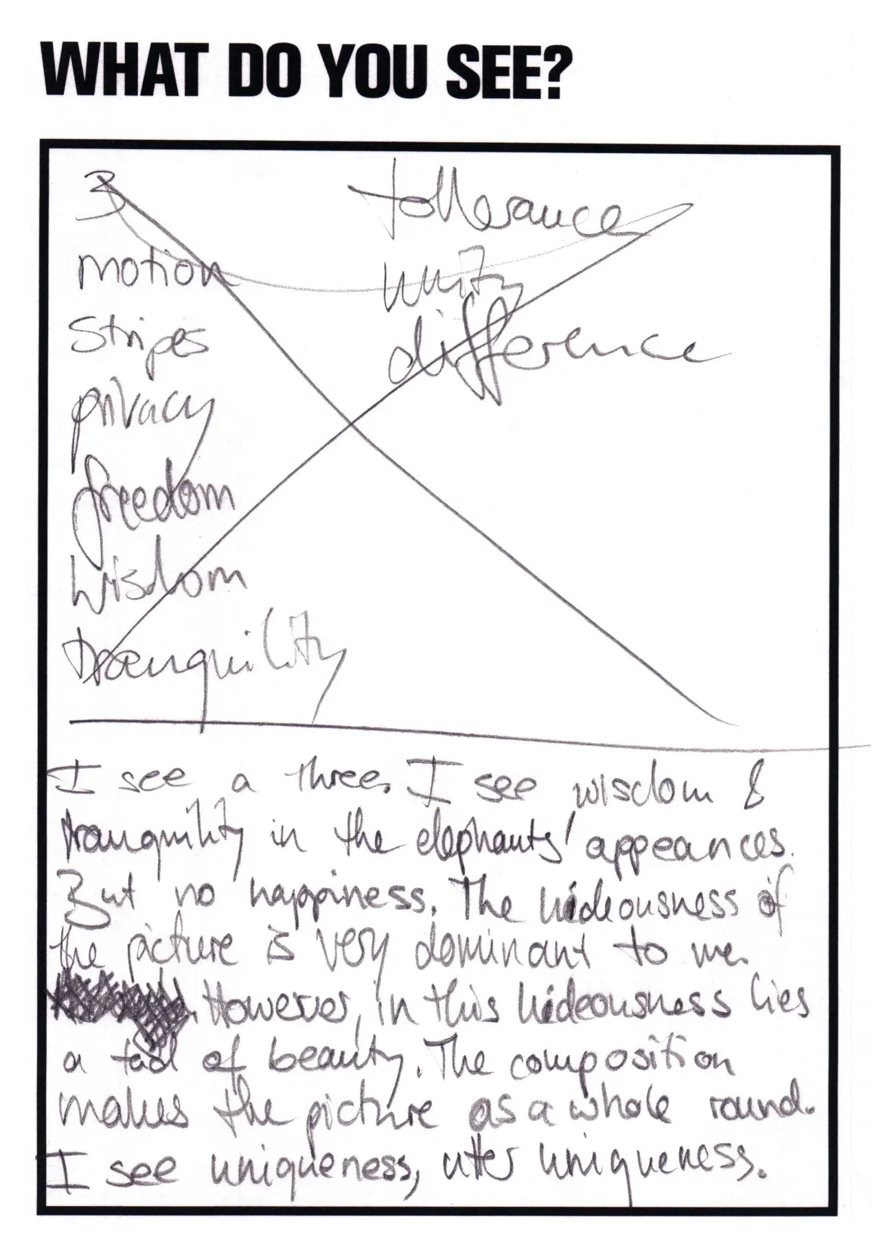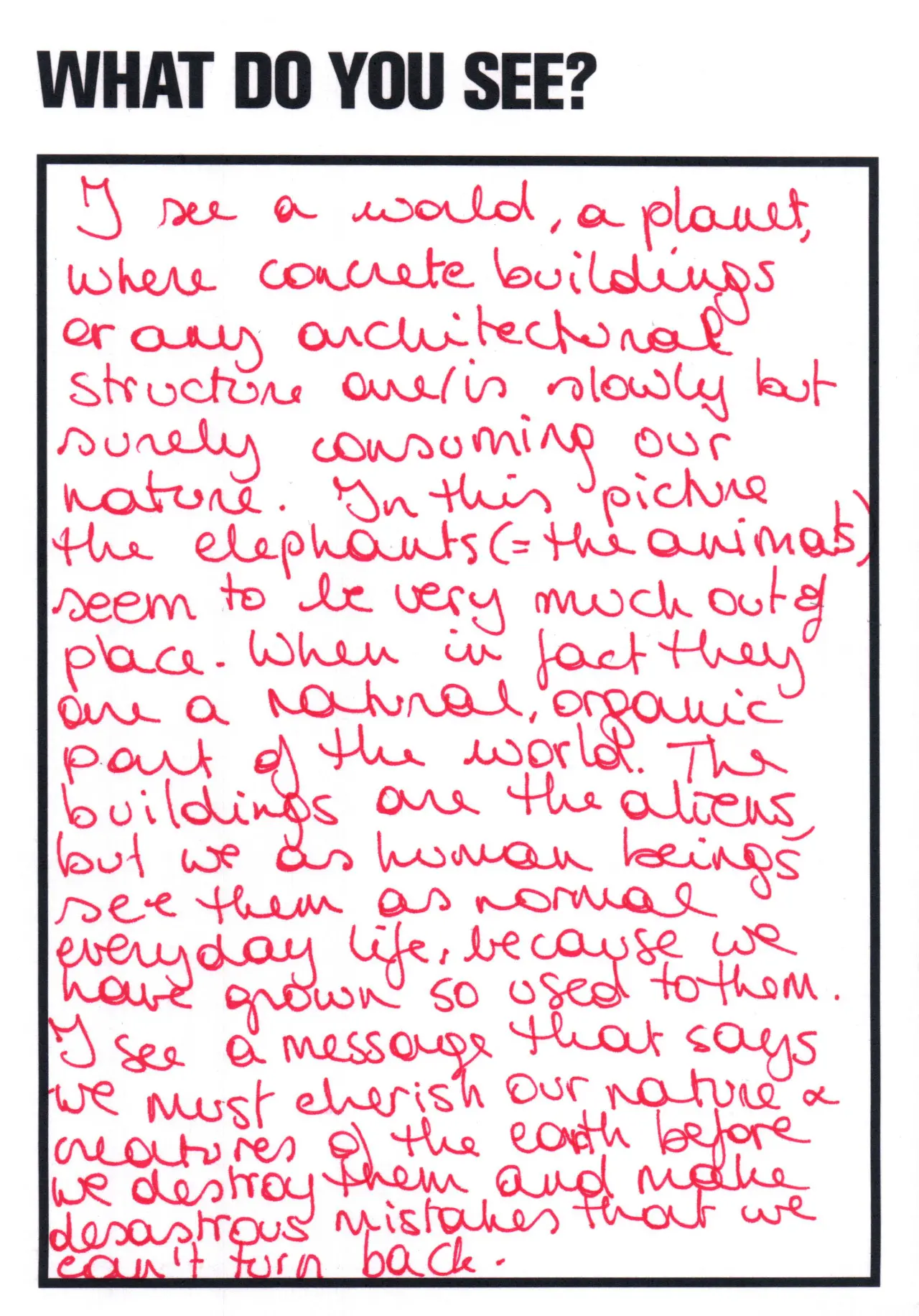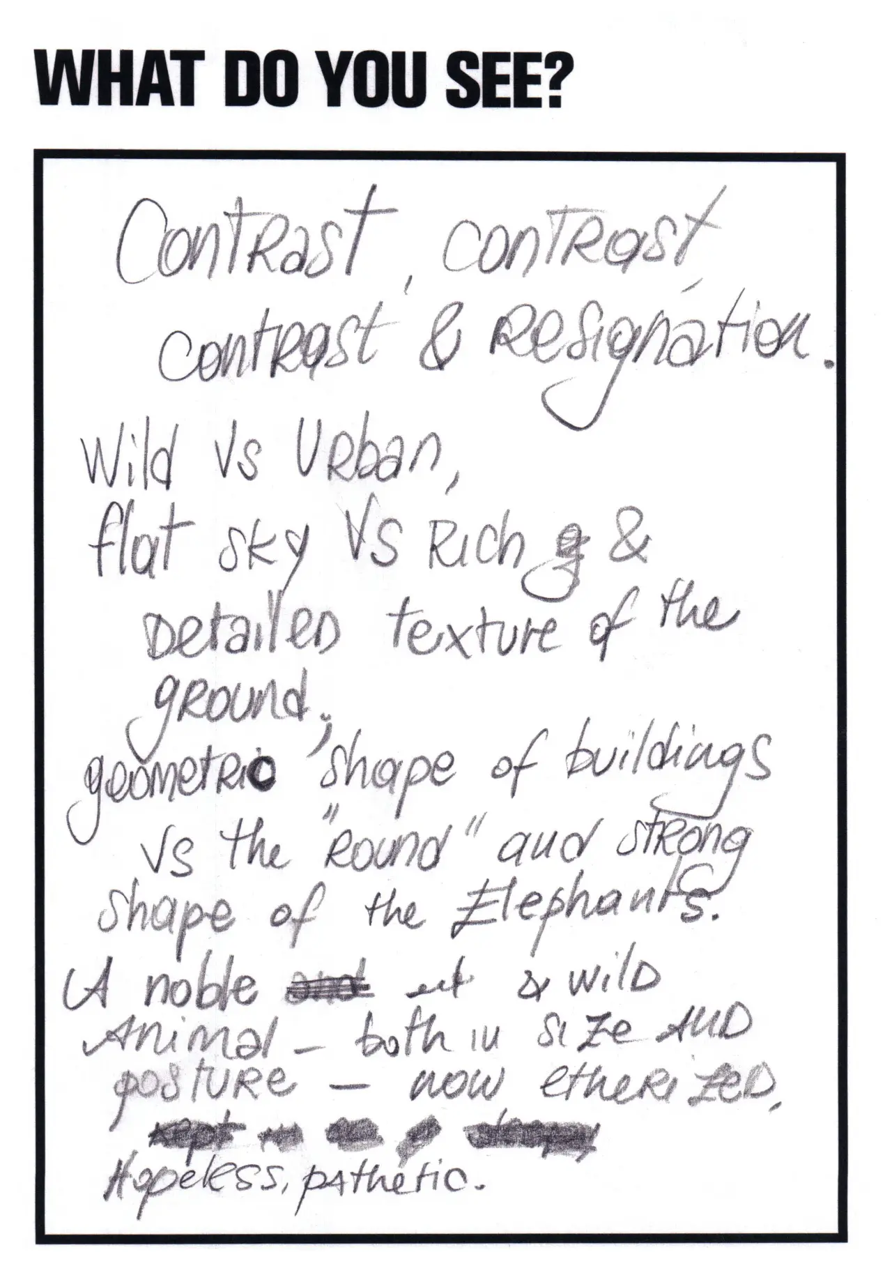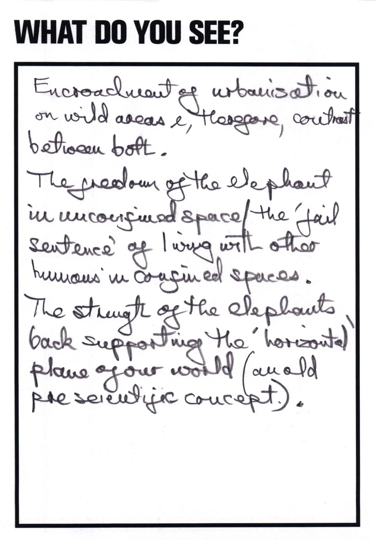 This photograph featured as part of the Touchstone programme (2012-2020). Each display consisted of a single photographic work on the Eranda studio floor where visitors were invited to respond to the question 'What do you see?' using the cards and pencils provided. A bench was placed in front of the work, encouraging people to spend a little longer than they might usually. The programme was part of a wider series of projects and activities related to visual literacy.