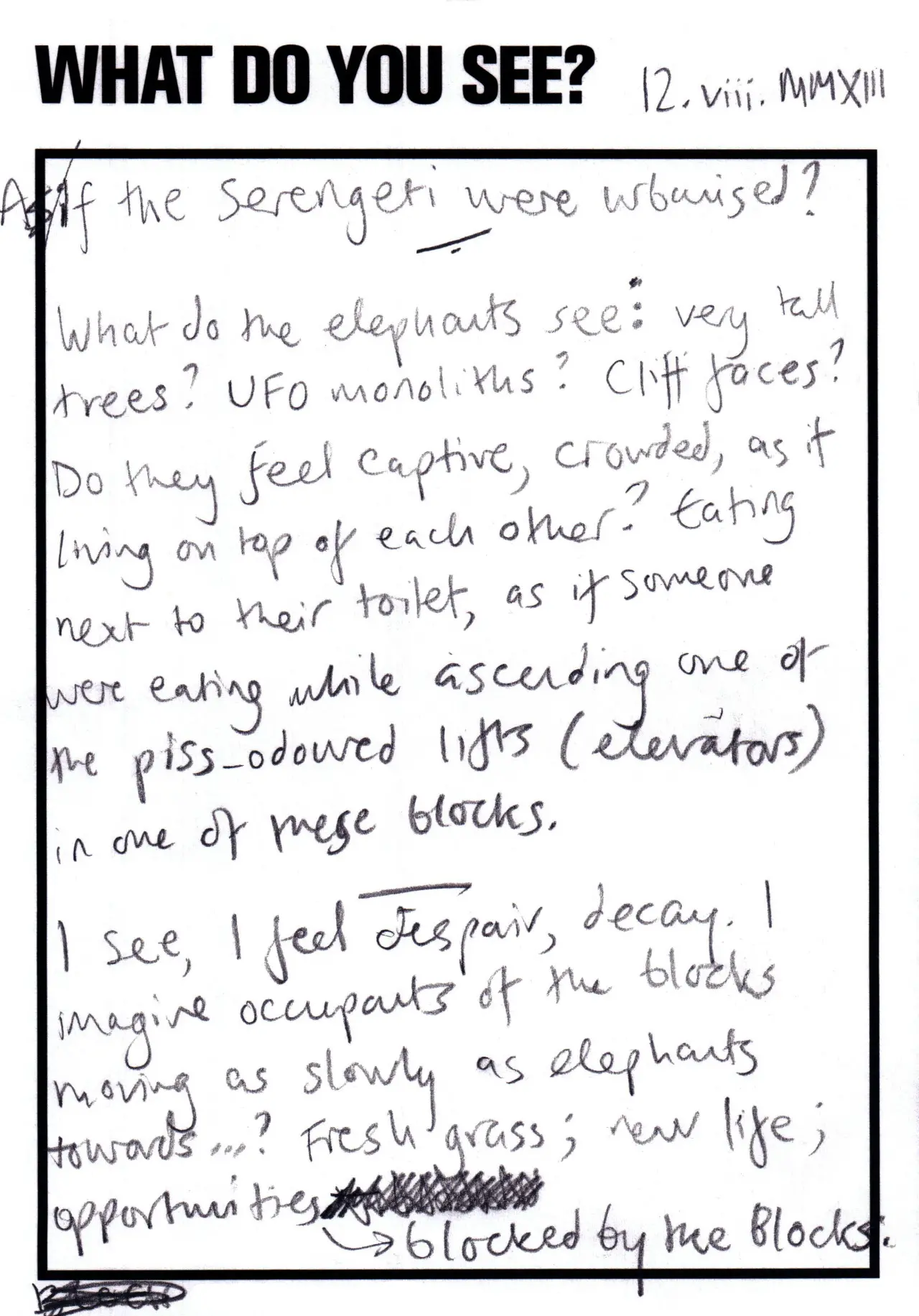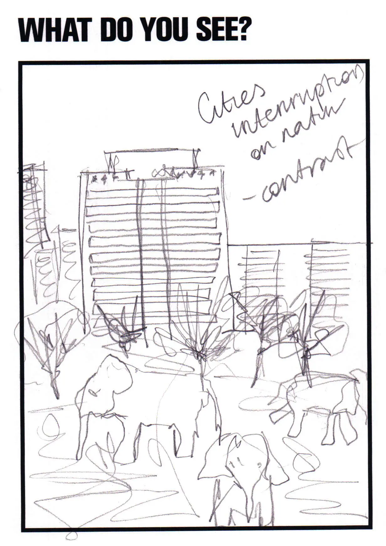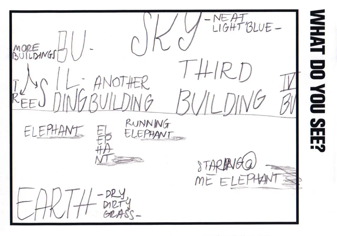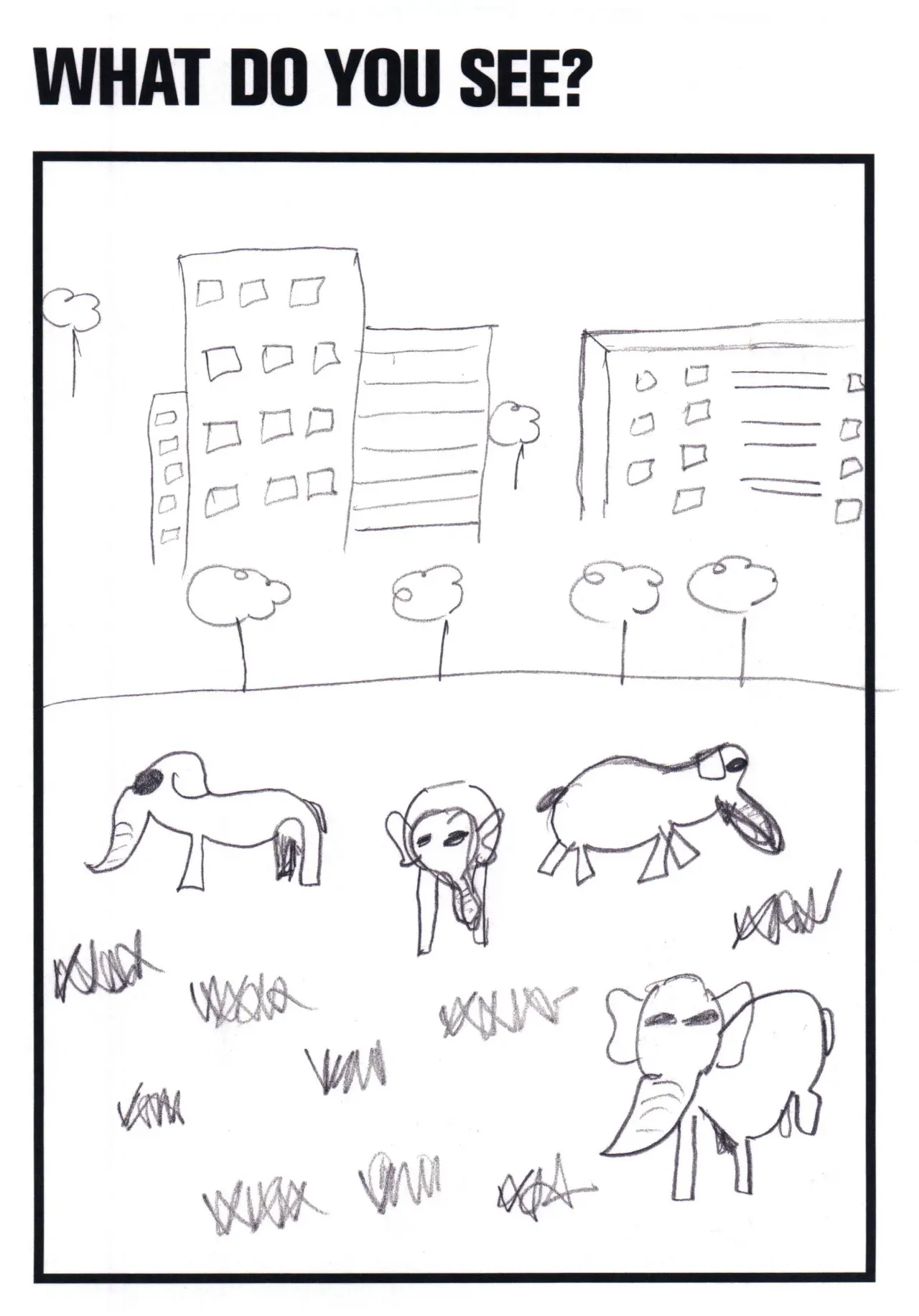 This photograph featured as part of the Touchstone programme (2012-2020). Each display consisted of a single photographic work on the Eranda studio floor where visitors were invited to respond to the question 'What do you see?' using the cards and pencils provided. A bench was placed in front of the work, encouraging people to spend a little longer than they might usually. The programme was part of a wider series of projects and activities related to visual literacy.