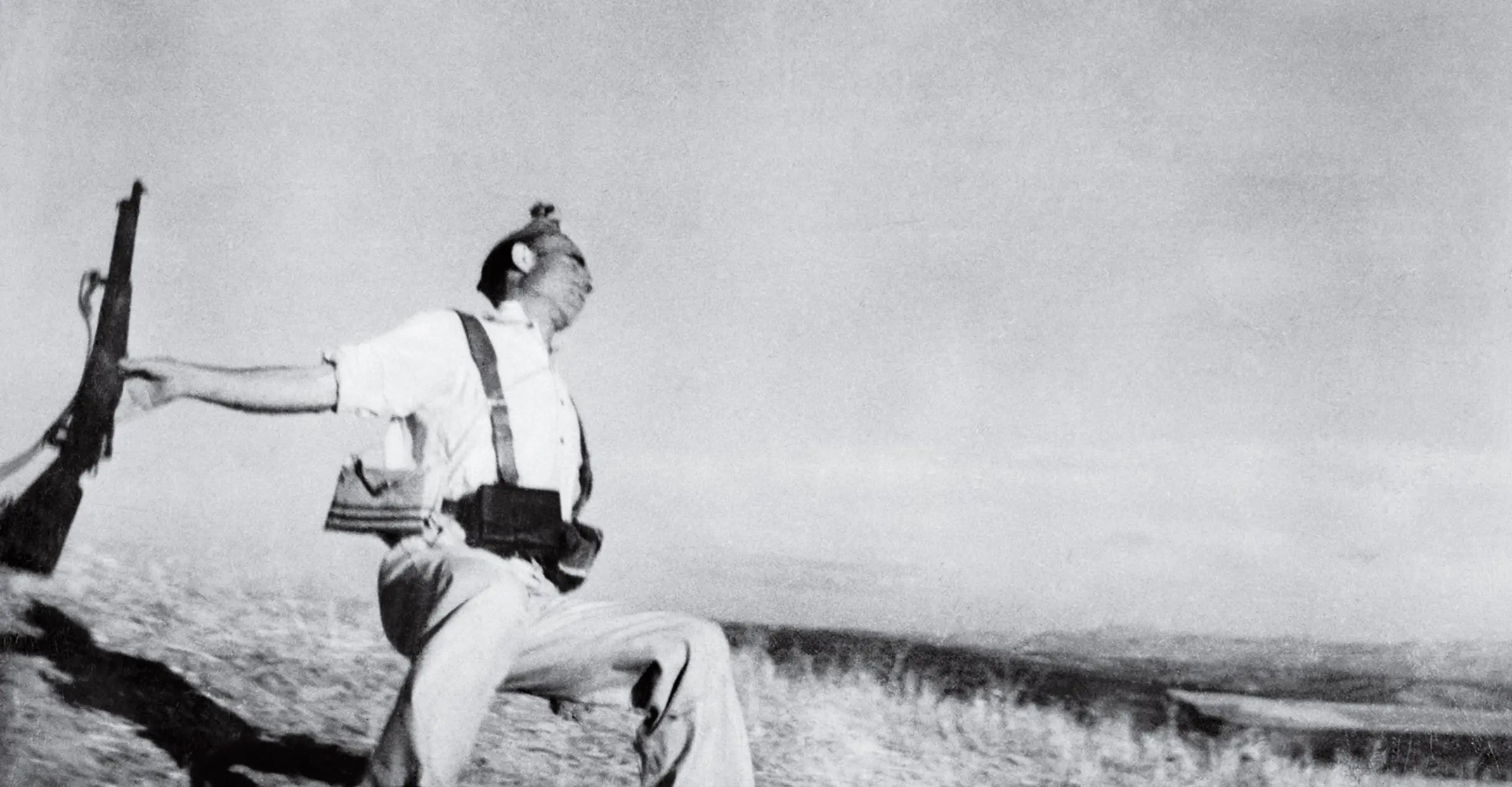 It was on 5 September 1936, on the front-line near the village of Cerro Muriano, that Capa was to take his most famous photograph -a Republican militiaman at the moment of death. The image was included in Vu later that month, weeks before Capa's twenty-third birthday. However, their has been much speculation over the authenticity of the photograph, particularly over recent decades. Questions were raised about Capa's position in relation to the soldier, why his camera was focussed at that point, and why there is no sign of a wound (the man is wearing a head-scarf, the knot of which is often assumed to be a bullet wound). To make matters worse, there are no contact sheets which record the sequence of events and even these negatives have been lost, including that of the famous photograph itself. Capa failed to dispel reservations during his lifetime, and his account contradicts others given by friends at the time.