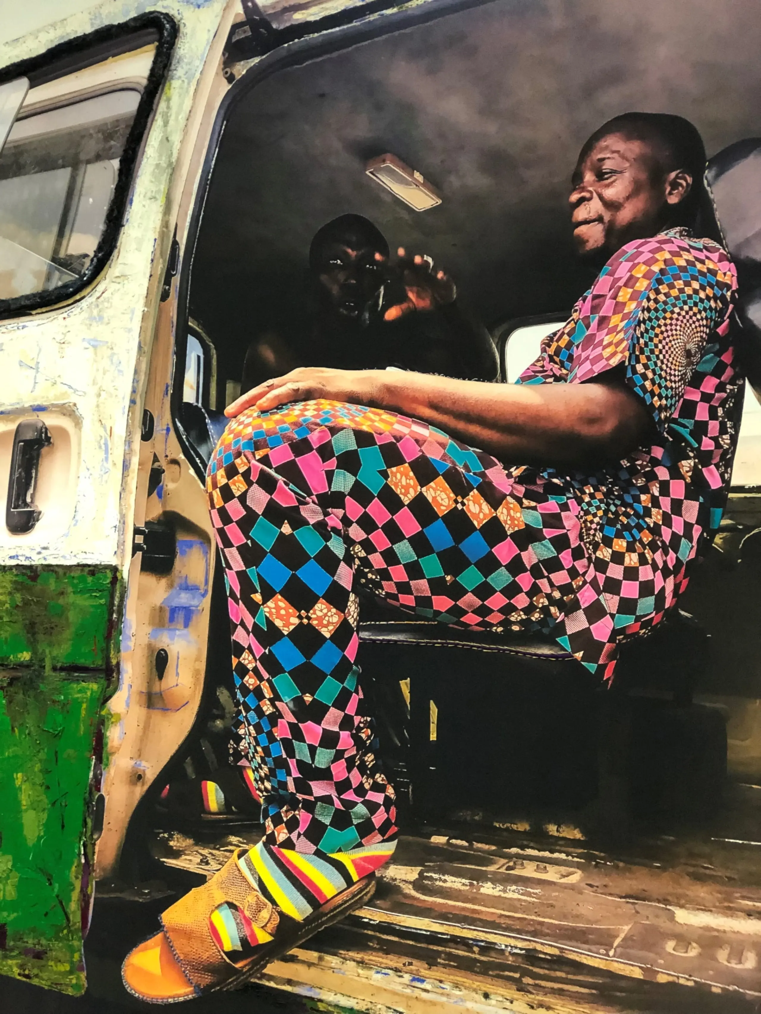 The piece Wá, make I tell you something incorporates 3 layered mediums: photography, paint, and recycled material. The foundational layer is a photograph shot in a Danfo bus in the heart of Isale Eko, Lagos, Nigeria at the end of the summer months during the ease of the first COVID-19 lockdown in 2020. The second layer is heavily textured oil paint, visible on the door frame of the bus. The final detailed layer consists of materials, such as cotton and thread that were embroidered onto the canvas to highlight various parts of the photograph. Isale Eko is very vivid and effervescent, but on the day this photo was taken, it was barren and silent, due to the first lockdown. I utilised vibrant colours to accentuate the vitality of the location when building my intricate textured layer. In this way, a transportive visual effect is created, placing viewers directly in the scene of the still shot photograph. The title translates to “Come, let me tell you something”, a common phrase in the vernacular, and indicative of the work’s soul.