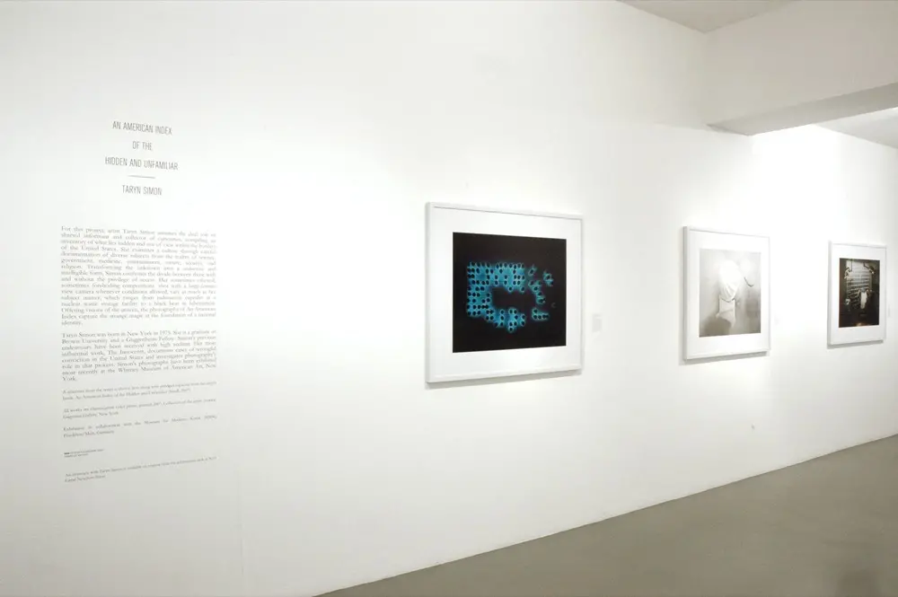 This exhibition is the first UK showing of Taryn Simon’s latest project, An American Index of the Hidden and Unfamiliar, a culmination of four years extensive research and documenting of the unseen and inaccessible hidden below the surface of national identity.