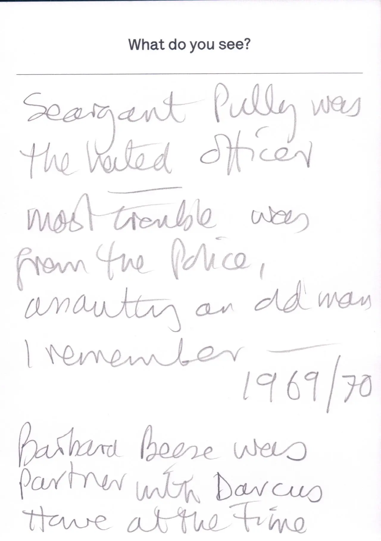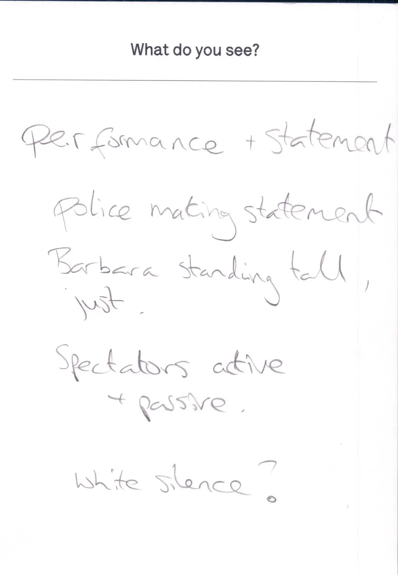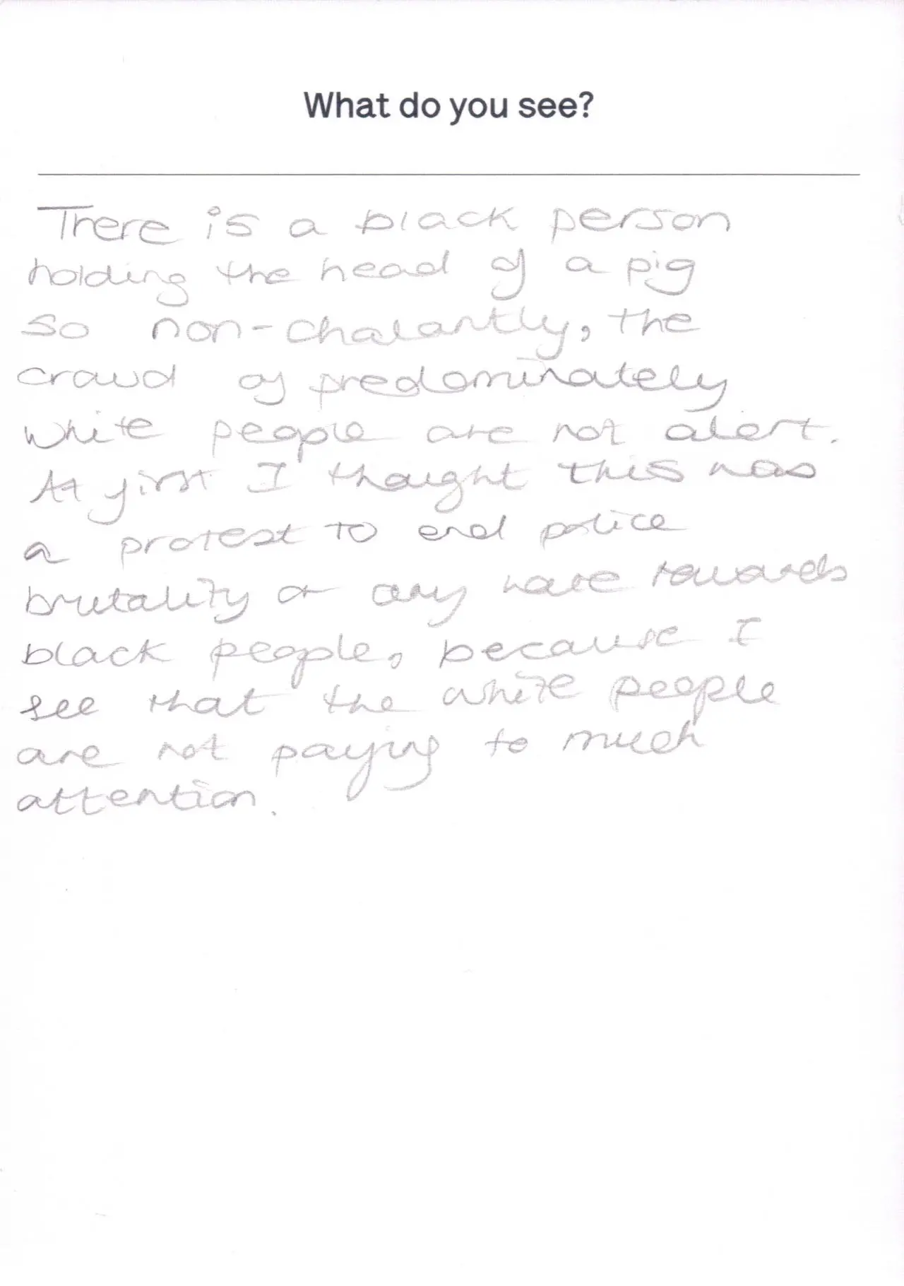 The photograph featured as part of the Touchstone programme (2012-2020). Each display consisted of a single photographic work on the Eranda studio floor where visitors were invited to respond to the question 'What do you see?' using the cards and pencils provided. A bench was placed in front of the work, encouraging people to spend a little longer than they might usually. The programme was part of a wider series of projects and activities related to visual literacy.