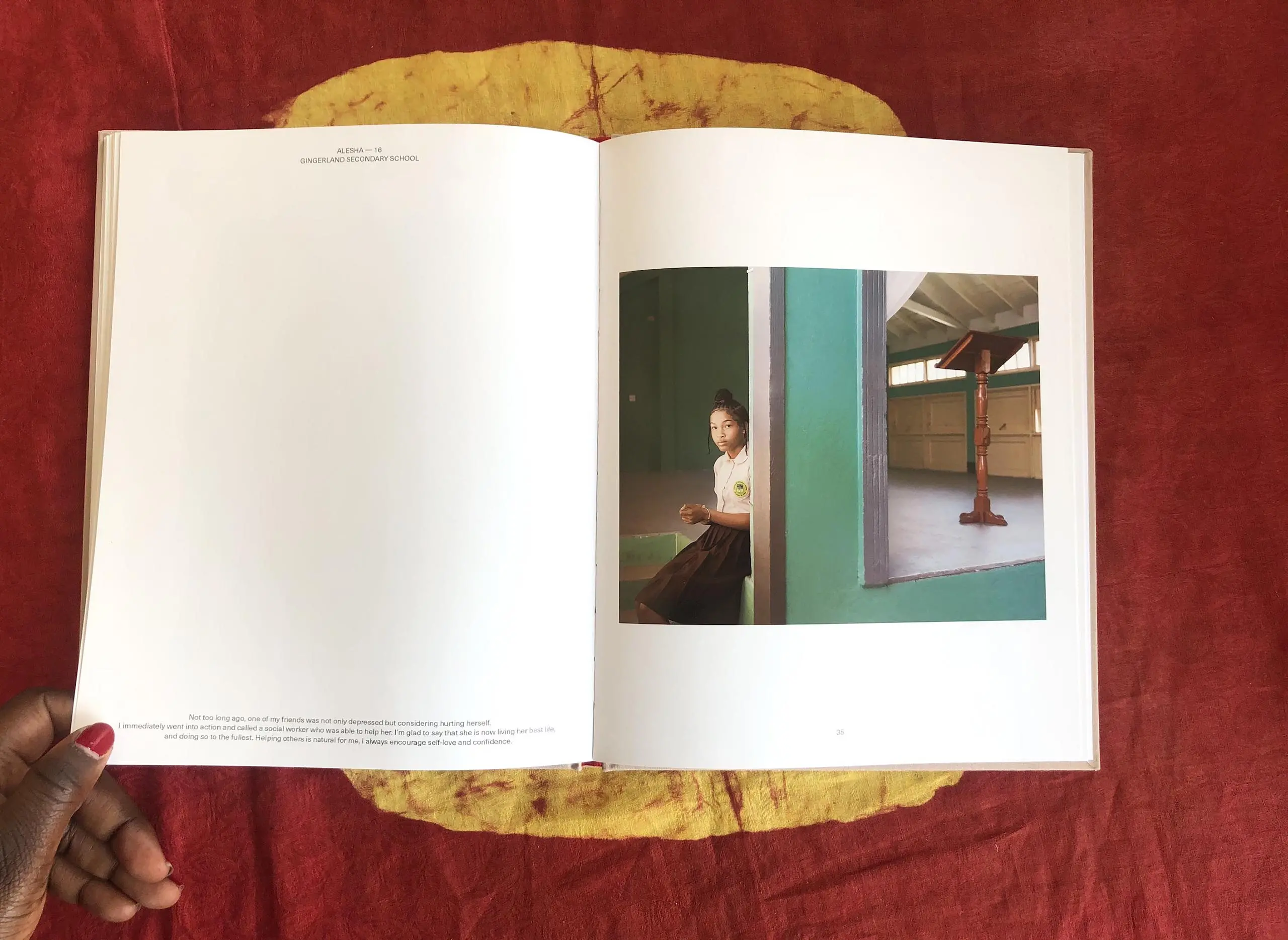 Take the photograph of Alesha, age 16, at Gingerland Secondary School (Jeffers' alma mater), for instance. It is a powerful image divided into two frames by a wall. One frame shows a podium on the same platform Jeffers stood on to give the valedictorian speech at his graduation years ago. The other frame shows Alesha sitting on the platform and adjusting her bracelet as she looks calmly at the camera like she might be looking at herself. In the gaze she holds with the photographer, she is not trying to entertain, prove or disprove either ability or confidence. Her composure says, “I am minding my business and I'm happy to let you in on it if you care to pay attention.” Her quote on the opposite page tells us of some of her business: "Not too long ago, one of my friends was not only depressed but considering hurting herself. I immediately went into action and called a social worker who was able to help her. I am glad to say that she is now living her best life."