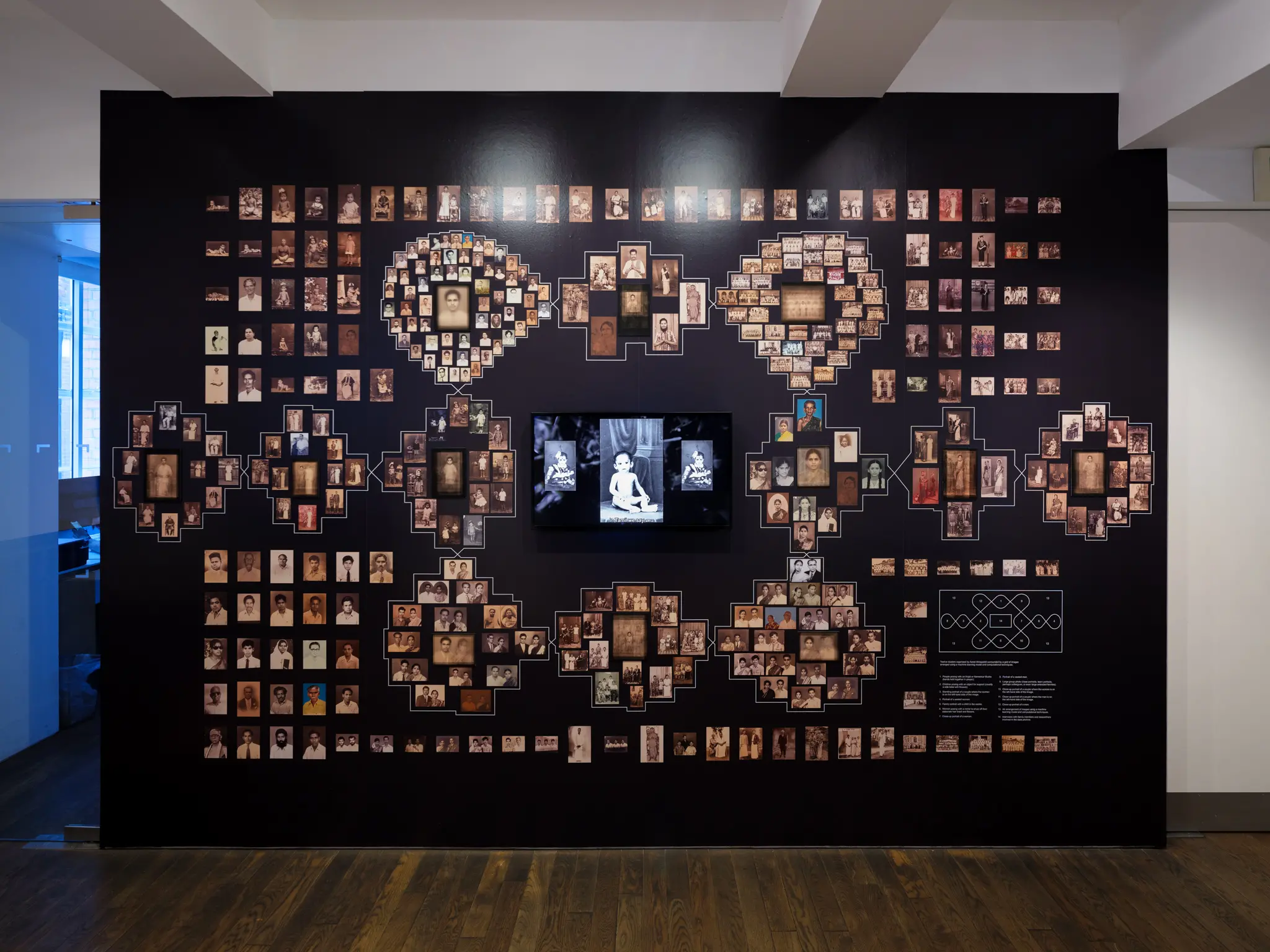 The installation takes the shape of a Kolam, where patterns are traditionally drawn with rice flour by women on their home entrance to welcome all but the evil spirits. In this case, the kolam is formed by groupings of photographs organised on a grid by an image classification algorithm, and assembled on clusters by Akkapeddi’s own artistic intervention. Each group is represented by a central image, a composite averaging all of the images within the cluster. A new digital interactive extension of the work invites visitors to pull apart the composites and learn about the source and cultural insights of each photograph.