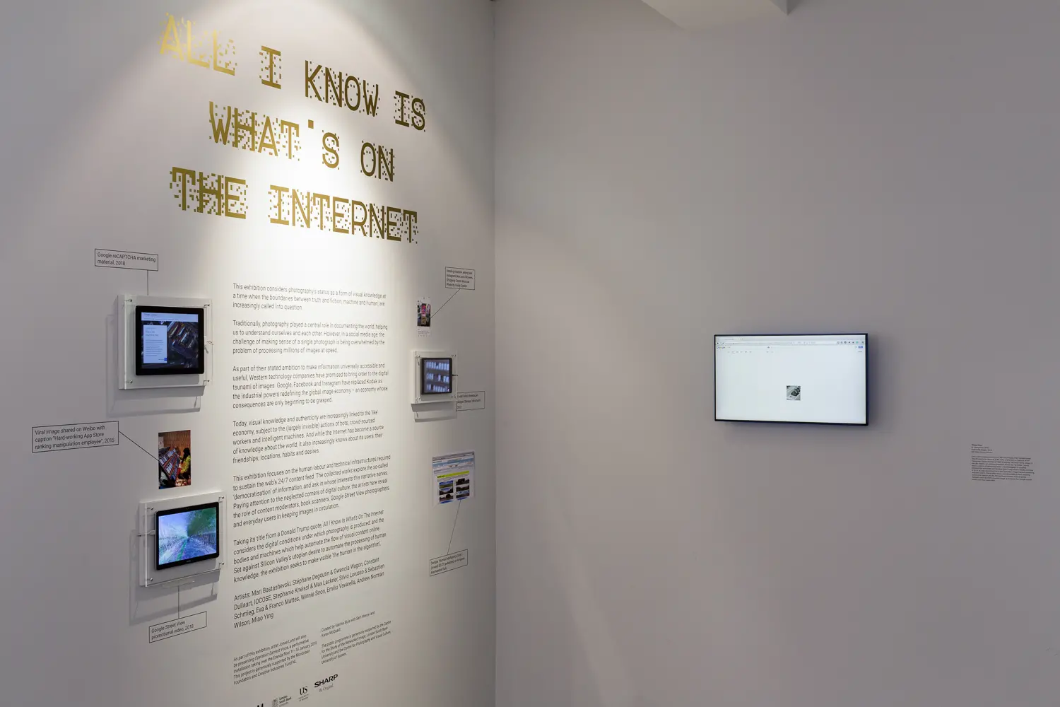 The exhibition considers the changing status of photography, as well as the agency of the photographer and the role of the viewer within this new landscape.  The artists involved draw attention to the neglected corners of image production, making visible the vast infrastructure of digital platforms and human labour required to support the endless churn of selfies, cat pics and memes.  Certain works draw specifically on the experiences of content moderators, clickworkers and Google Street View photographers, and invite visitors to consider their own position in the image flow.