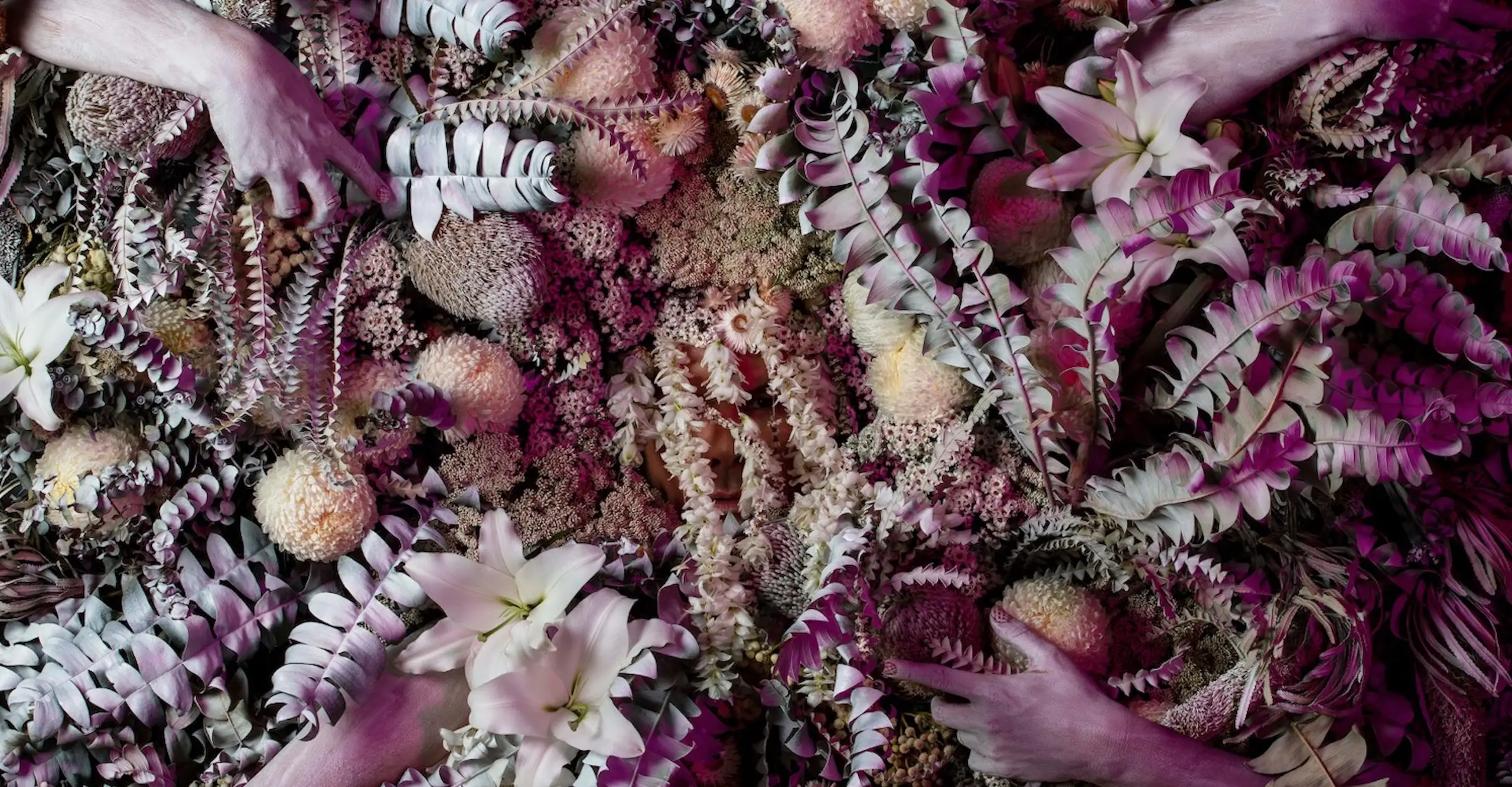In Flower Walls (2018-ongoing) the artist is literally submerged in Australian native plants and flowers, overlapping and interwoven to create dense, vibrant compositions of colour and texture. Glimpsed amongst the foliage are parts of Thompson’s face and hands, which seem to both simultaneously appear and disappear within the arrangement. The presentation for SPQ features the latest work in the Flower Wall series, Being Human Human Being (2022) – which provides the overall title. Commissioned by Photo Australia, this presentation marks its international premiere.