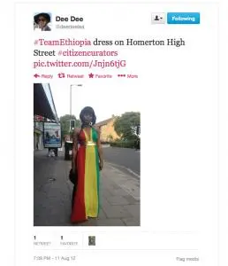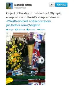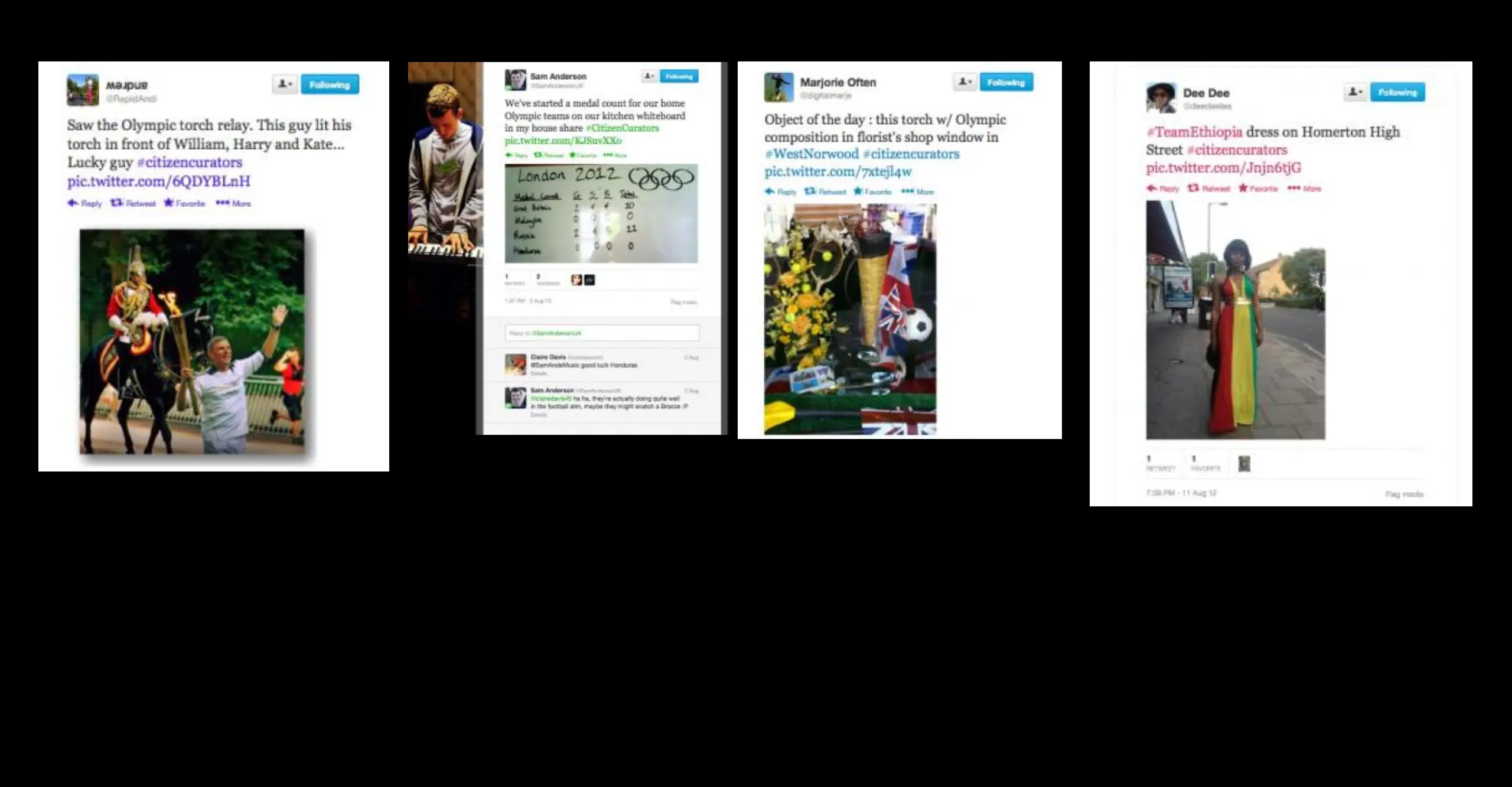 #citizencurators is a Twitter project which documents the way Londoners responded to the Olympics of 2012. It aims to show how the contemporary history of London2012 could be recorded by the people who experienced it without the filtering of an institution.