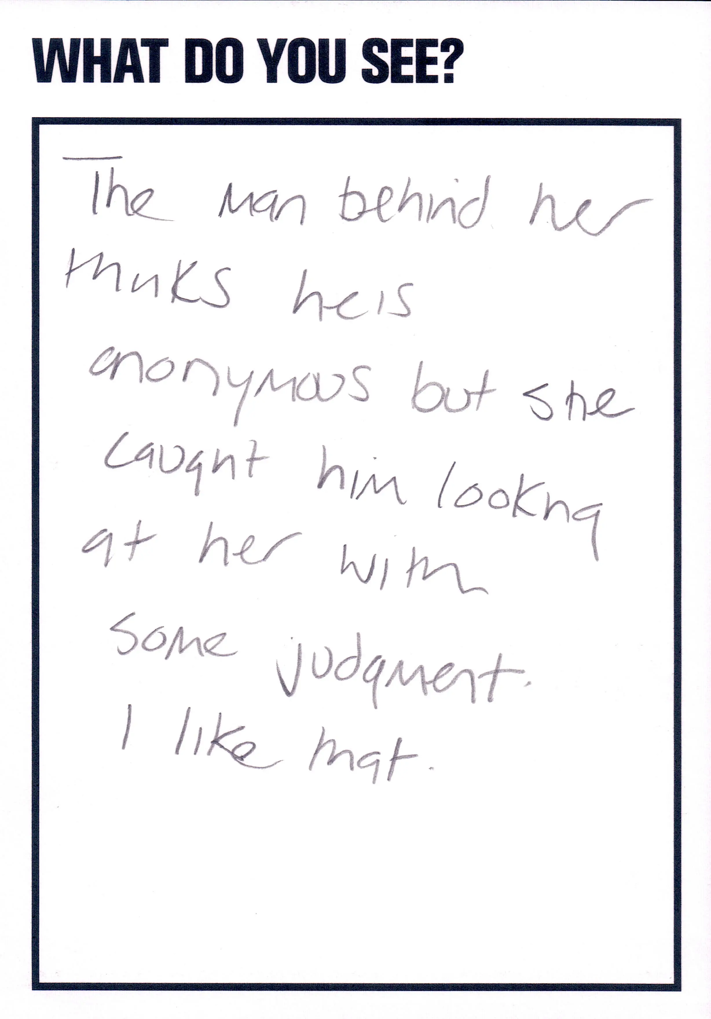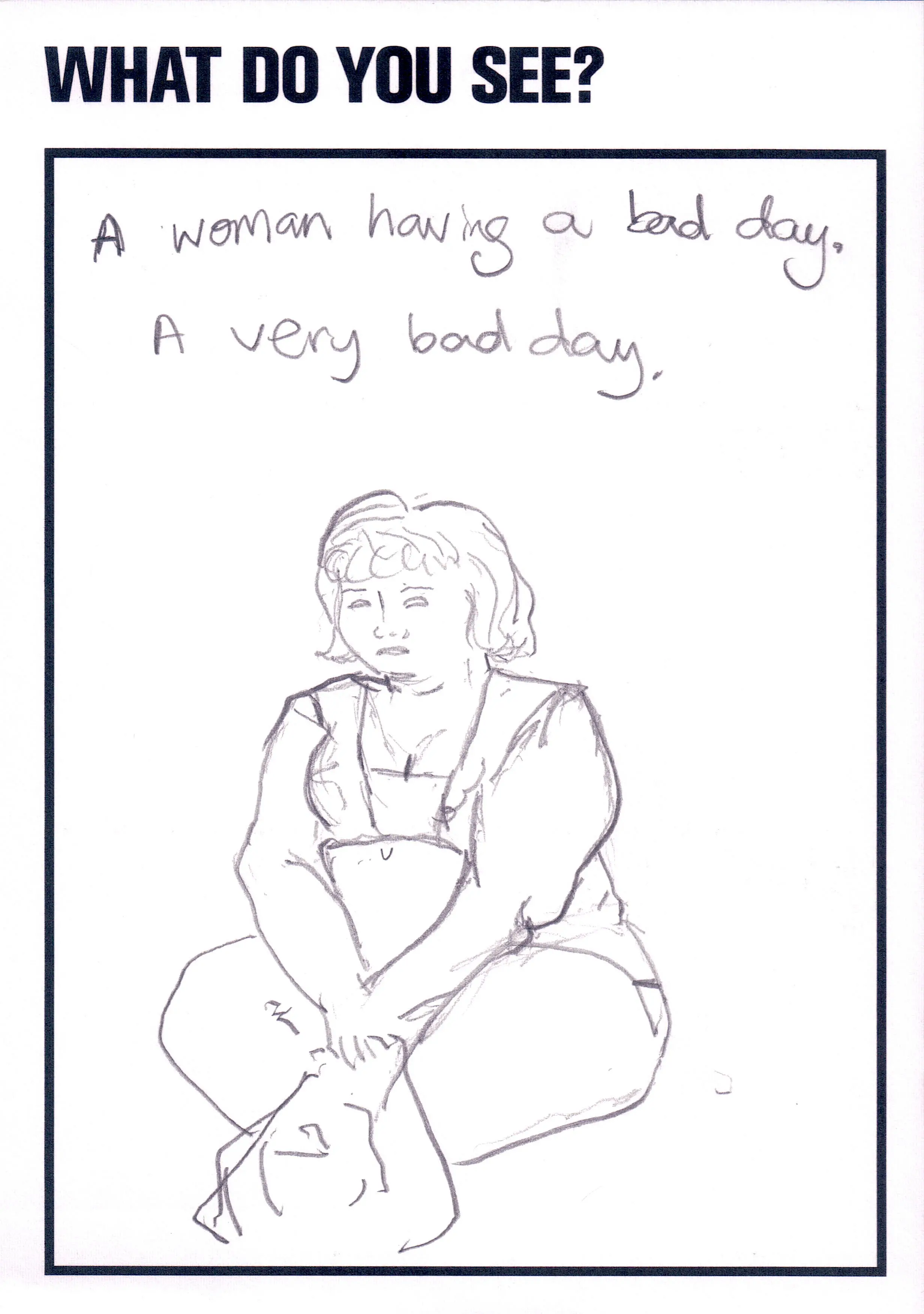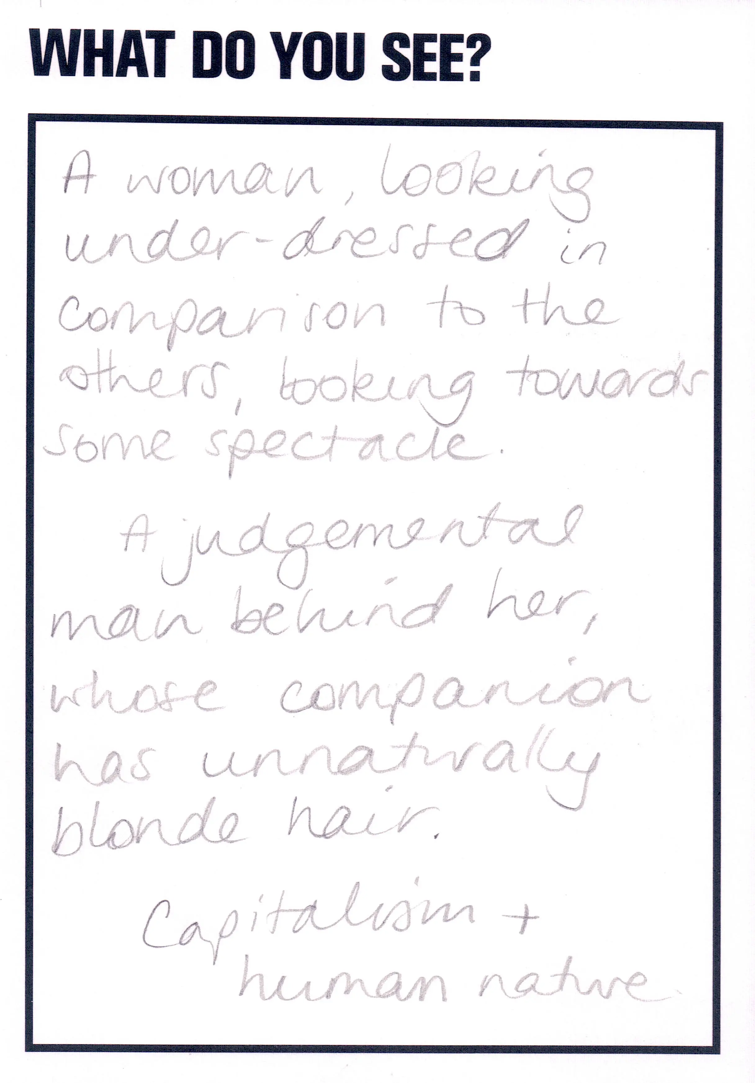 The photograph featured as part of the Touchstone programme (2012-2020). Each display consisted of a single photographic work on the Eranda studio floor where visitors were invited to respond to the question 'What do you see?' using the cards and pencils provided. A bench was placed in front of the work, encouraging people to spend a little longer than they might usually. The programme was part of a wider series of projects and activities related to visual literacy.