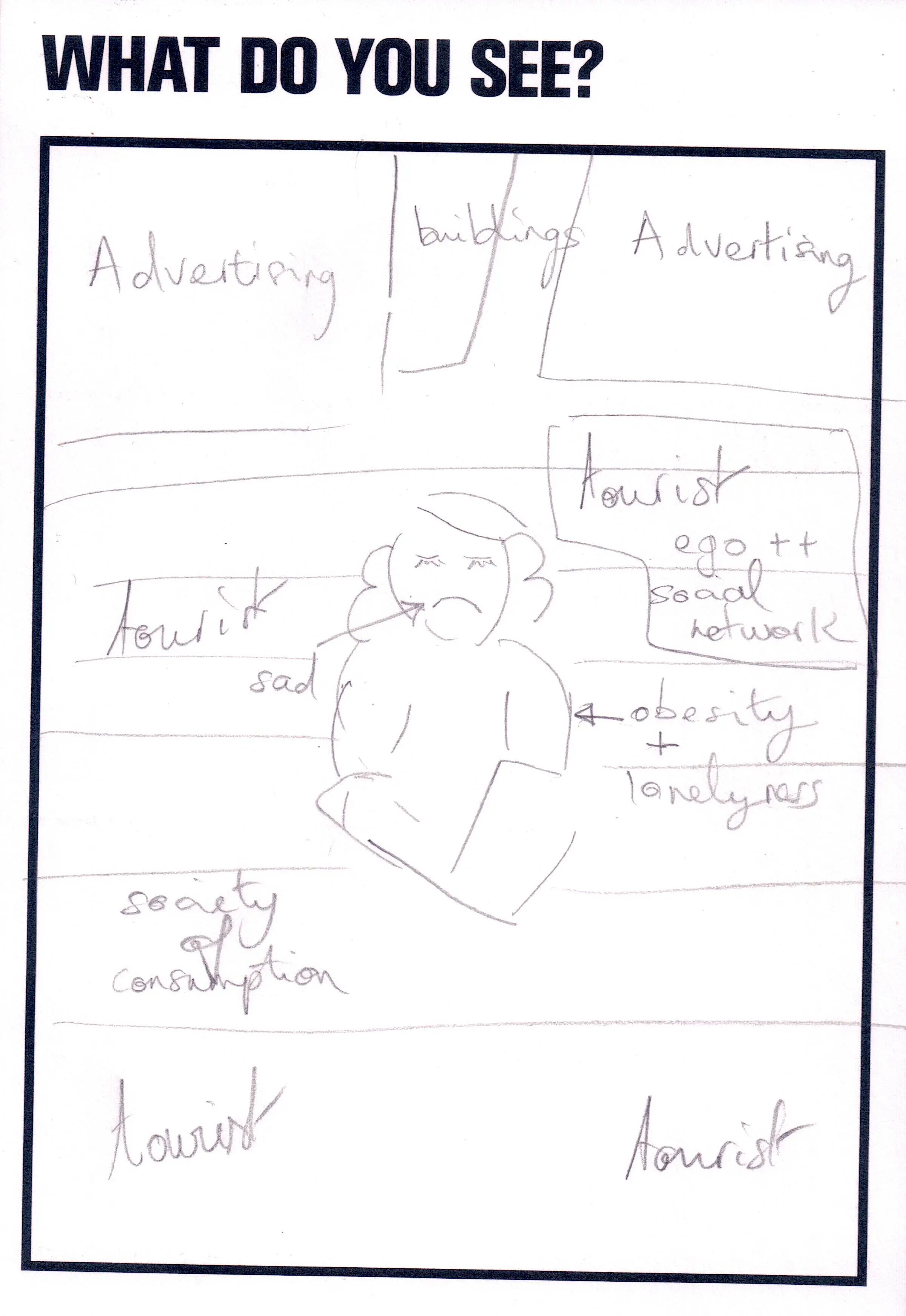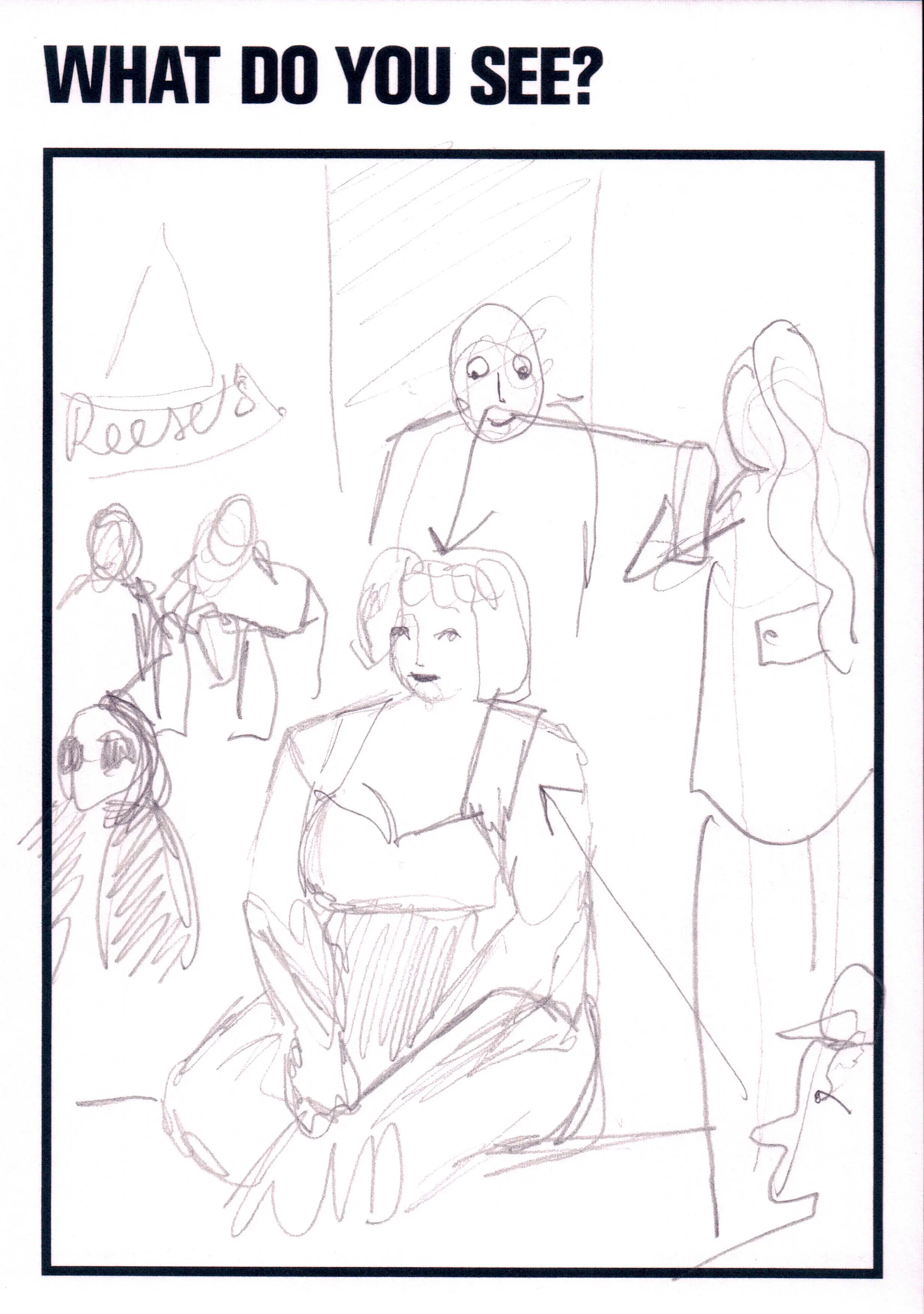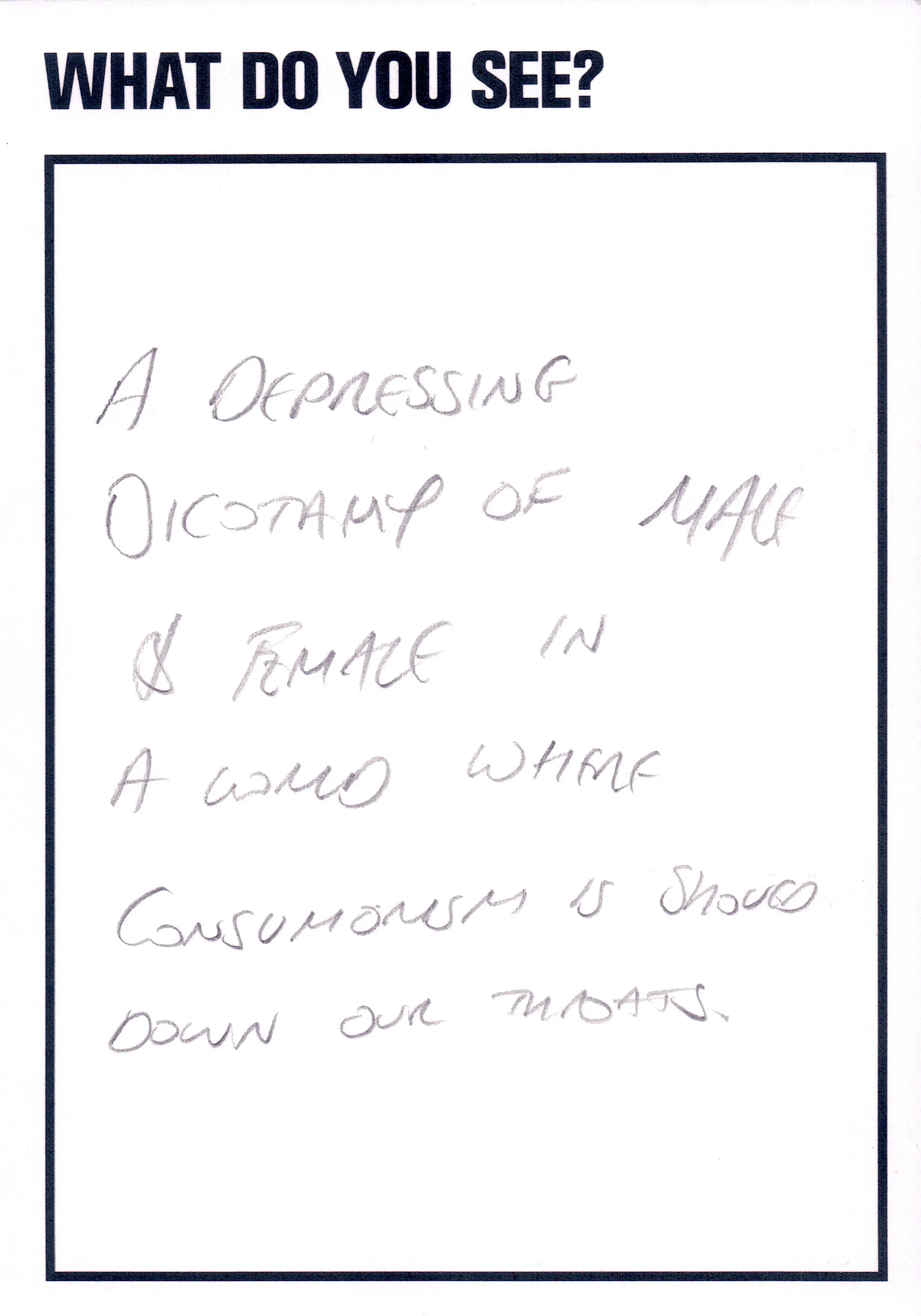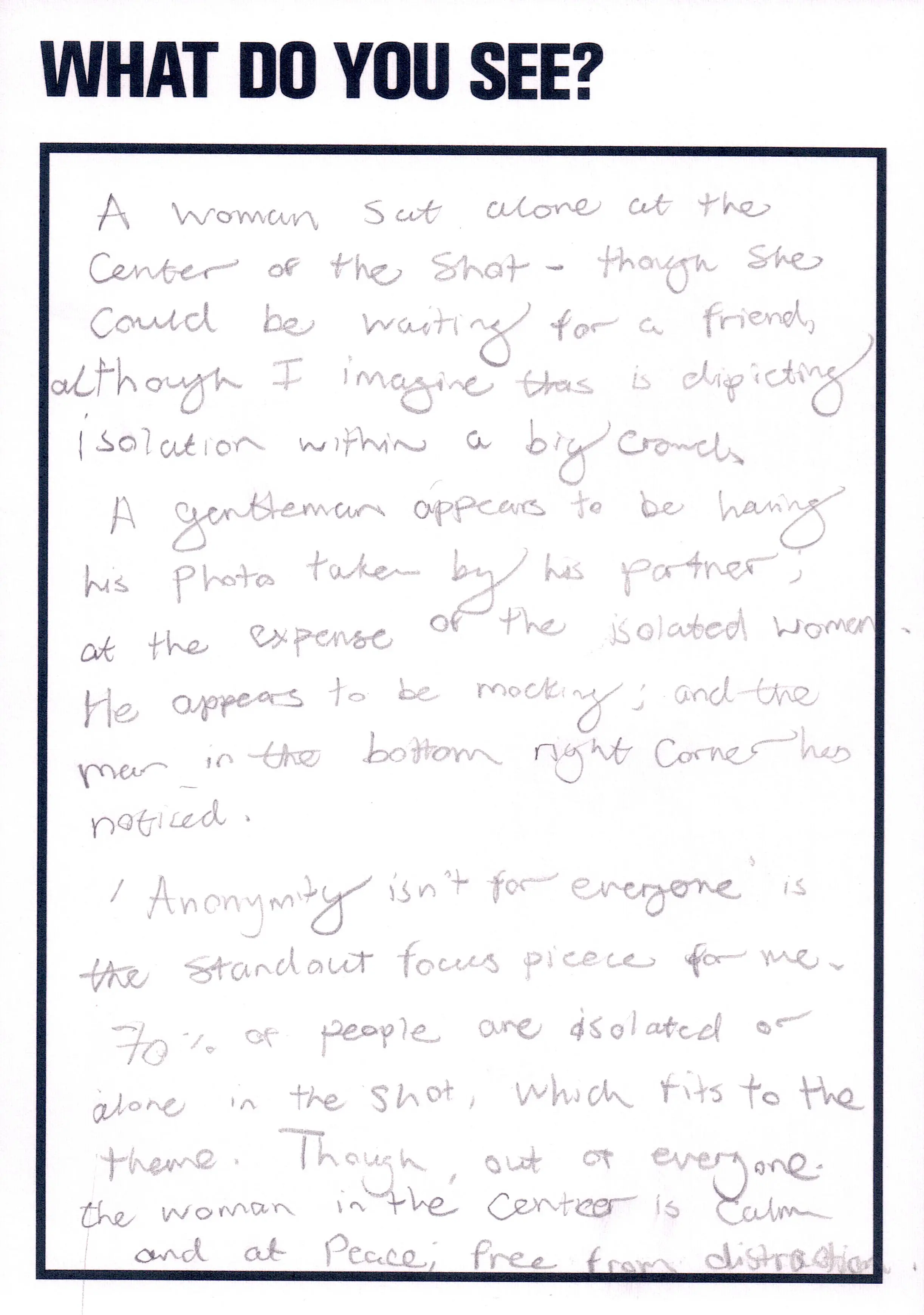 The photograph featured as part of the Touchstone programme (2012-2020). Each display consisted of a single photographic work on the Eranda studio floor where visitors were invited to respond to the question 'What do you see?' using the cards and pencils provided. A bench was placed in front of the work, encouraging people to spend a little longer than they might usually. The programme was part of a wider series of projects and activities related to visual literacy.