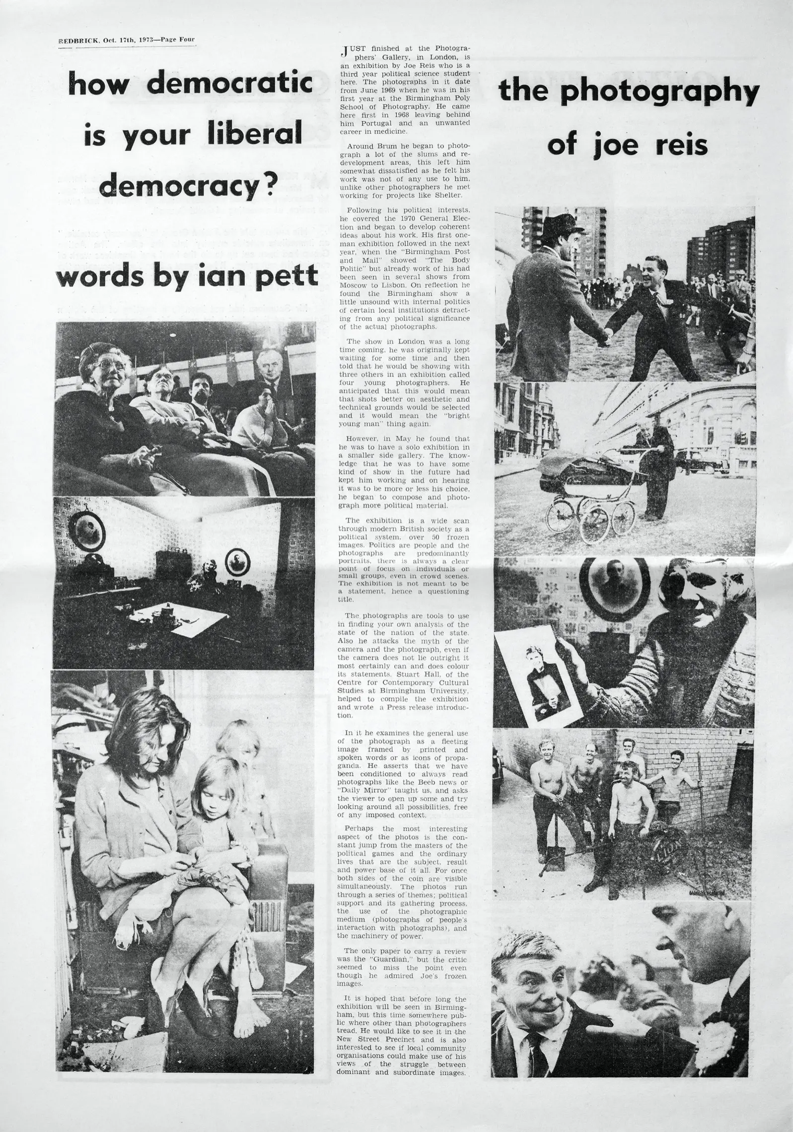 Photographs of public figures, or of politicians, or of the political process are among the most "natural" photos we possess. But that is because such images appear frequently, in the mass media, in a code with which we are familiar: that is the code of the news, of the news-photograph. There seems to be little more to find out about such photographs. The story is about the Prime Minister: and there he is, wearing a public face. The images of public men have already been pre-coded for us - as part of the "news". But the pictures themselves rarely become the subject of a political discourse: or rather, the political rhetoric, of which these pictures form a part, rarely itself becomes or is made visible. Public men are part of a public world and appear in public postures: that is one, self-contained world: is there anything more to be discovered there? On the other hand, ordinary men and women are outside the public world: we look on at the public world, and at the people who are part of its spectacle. When "we" are photographed, we are "ordinary people": the photographs of us are not "news", but "human interest". There we are, looking cheery, or stubborn, but confined within our own circle - the circle of the "human". What connection is there between the images of the "public" and the images of the "purely human"? Have ordinary people any right to "read" the images of public men in ways the subjects do not define for themselves? Do ordinary people have access to any code - any way of reading which would give them insight into how and why the public world looks like it does?