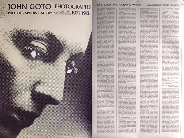 In this, Goto’s first exhibition, he showed five series of photographs made over the preceding decade. With the intention of disrupting the prevailing conventions of exhibition display, he incorporated graphic and cinematic elements into the gallery presentation.