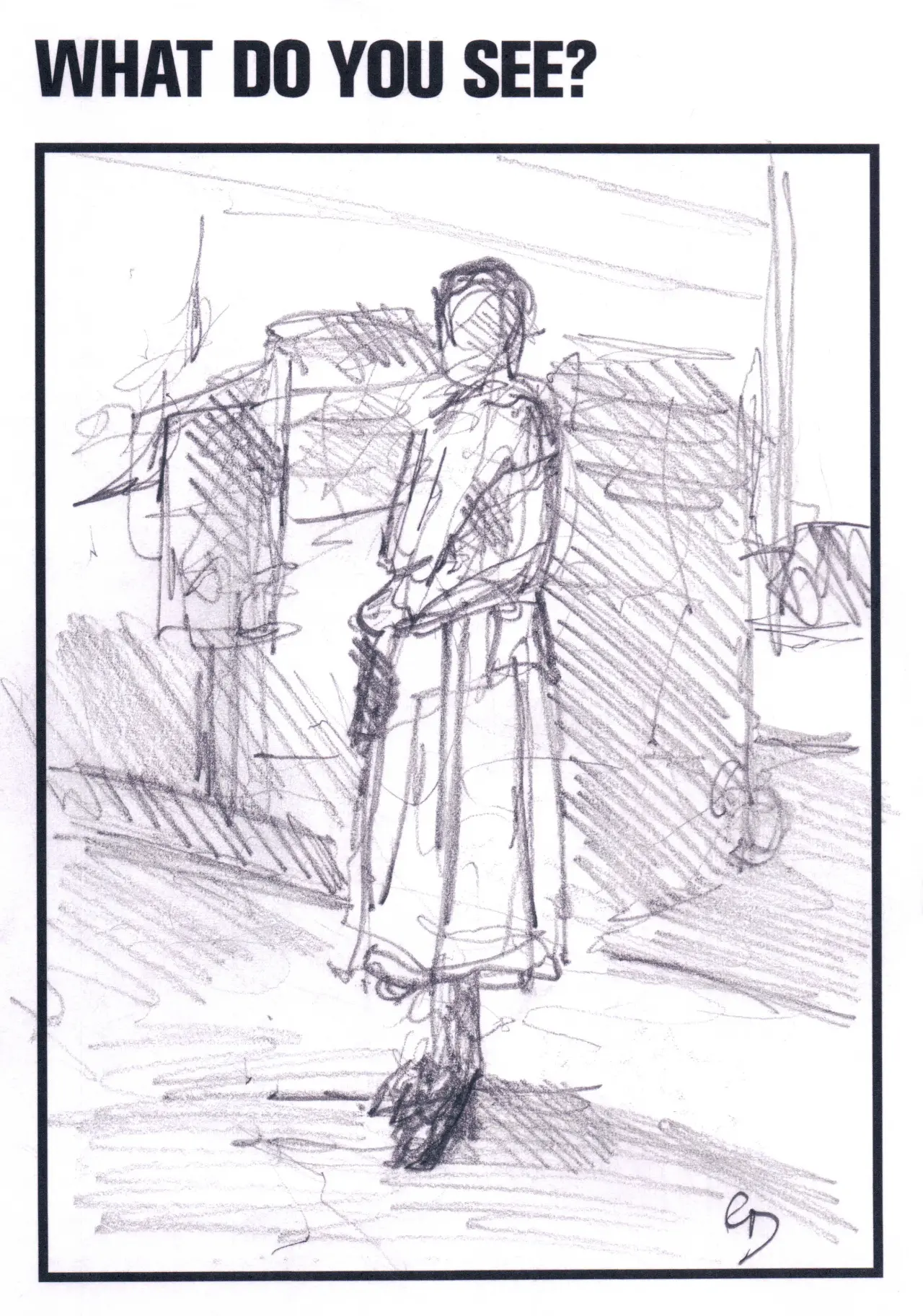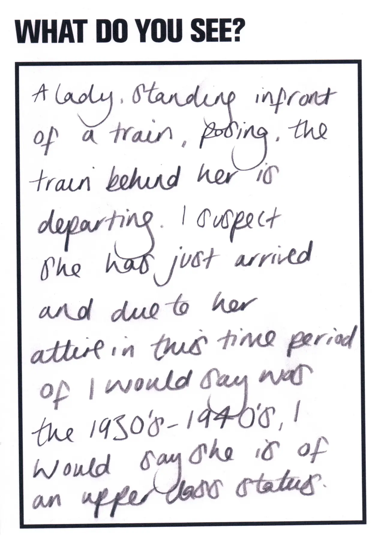 This photograph featured as part of the Touchstone programme (2012-2020). Each display consisted of a single photographic work on the Eranda studio floor where visitors were invited to respond to the question 'What do you see?' using the cards and pencils provided. A bench was placed in front of the work, encouraging people to spend a little longer than they might usually. The programme was part of a wider series of projects and activities related to visual literacy.