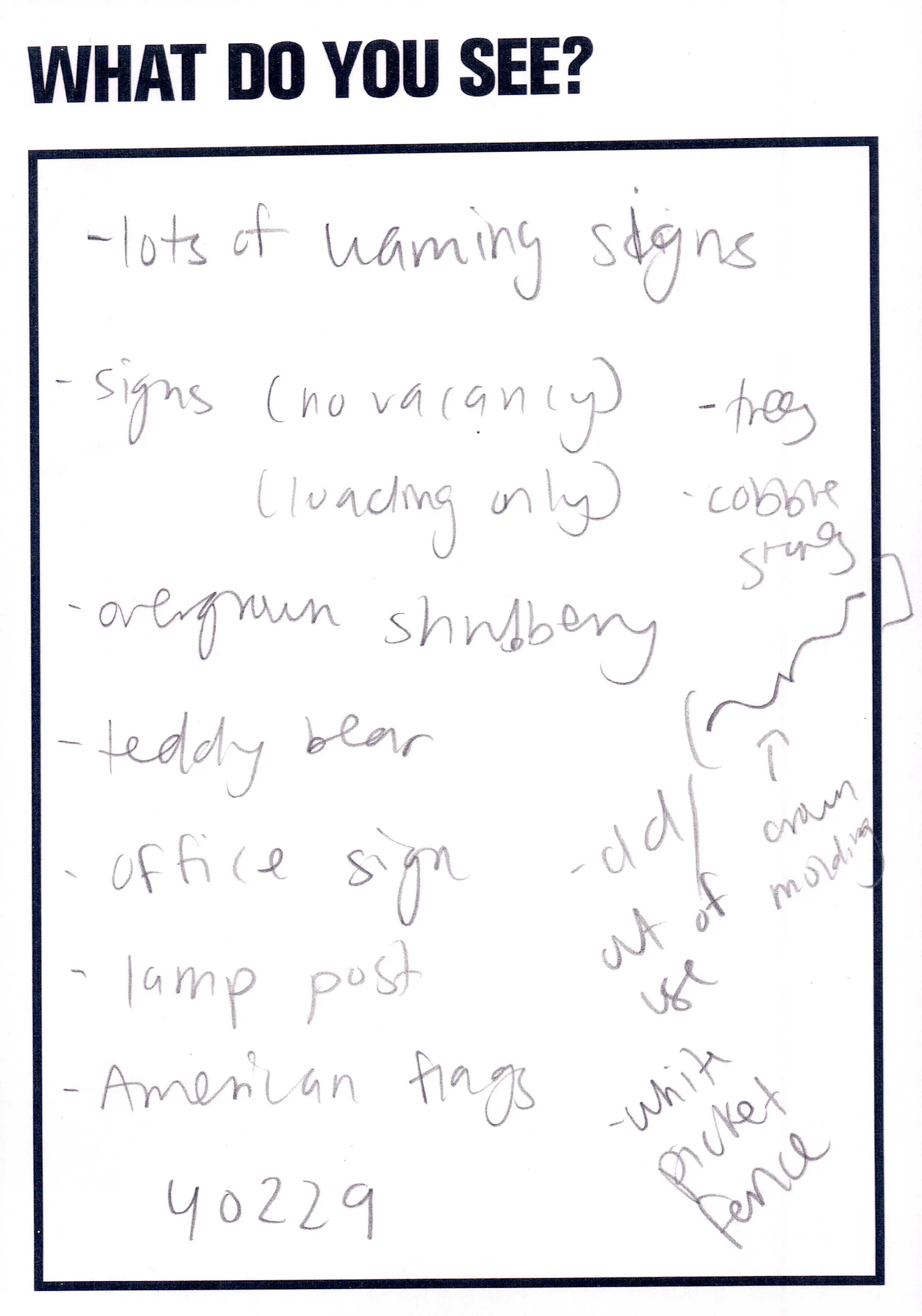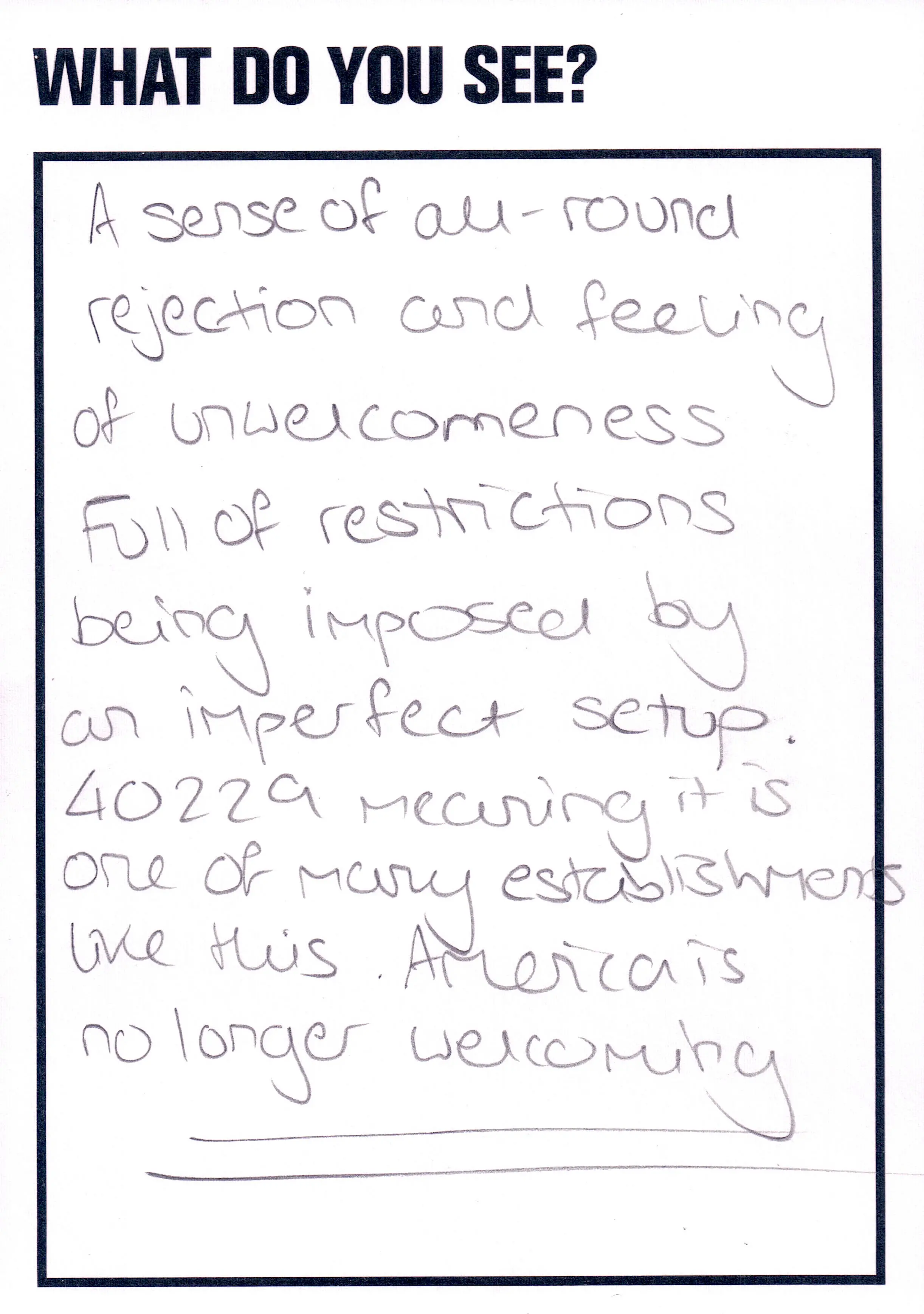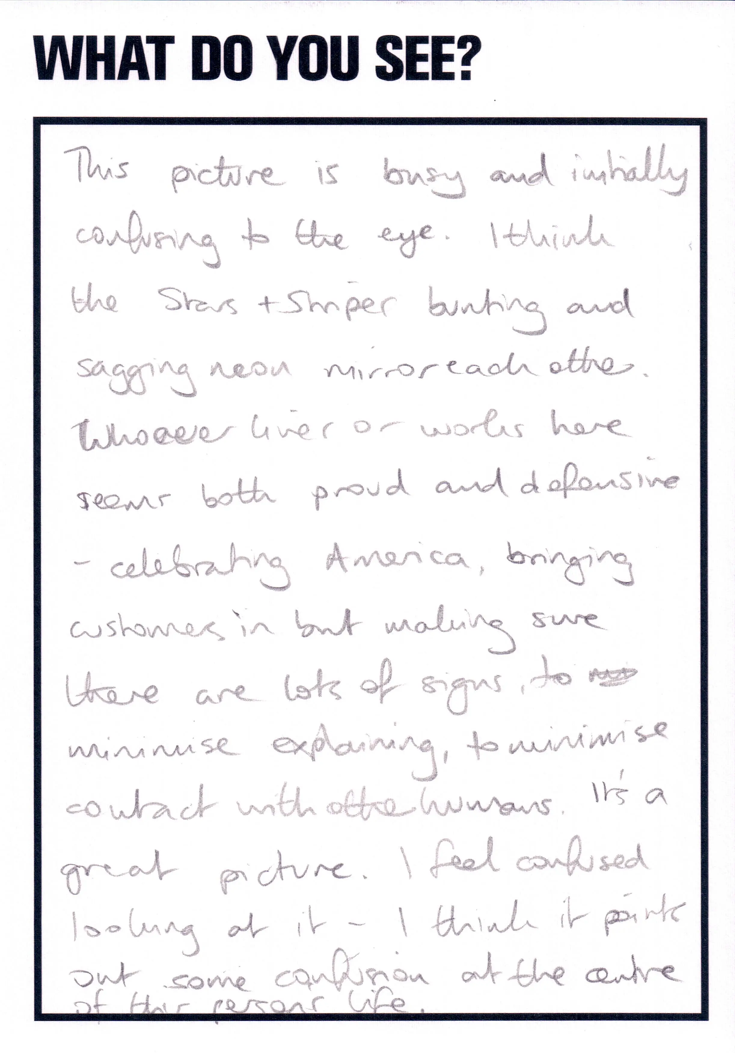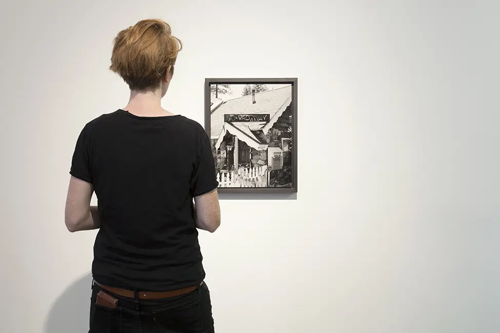 This artwork featured as part of the Touchstone programme (2012-2020). Each display consisted of a single photographic work on the Eranda studio floor where visitors were invited to respond to the question 'What do you see?' using the cards and pencils provided. A bench was placed in front of the work, encouraging people to spend a little longer than they might usually. The programme was part of a wider series of projects and activities related to visual literacy.