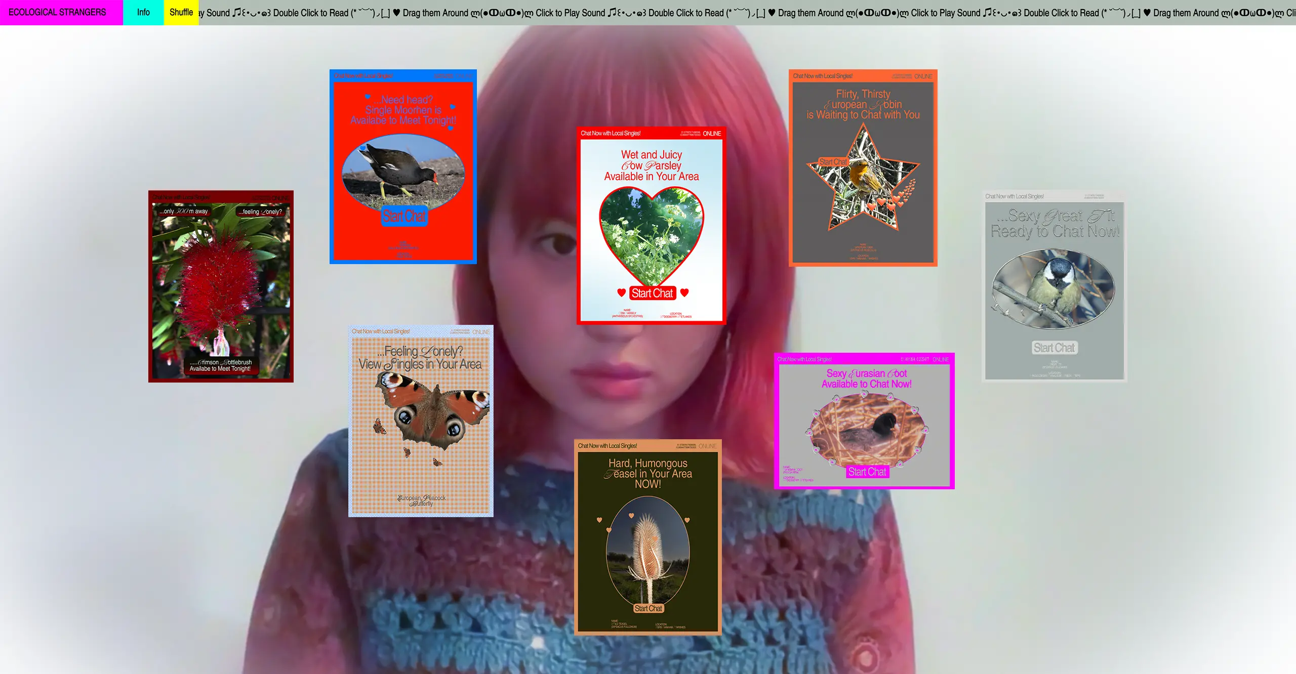 Ecological Strangers was originally created as an interactive browser extension by Kim in 2022 to disrupt the relentless demands of technologically enforced productivity culture. Through pop-ups and soundscapes of natural wildlife (including birds and plants), the extension urged users to confront "species loneliness"— our growing disconnection from the natural world—and redirect our attention to the spaces around us.