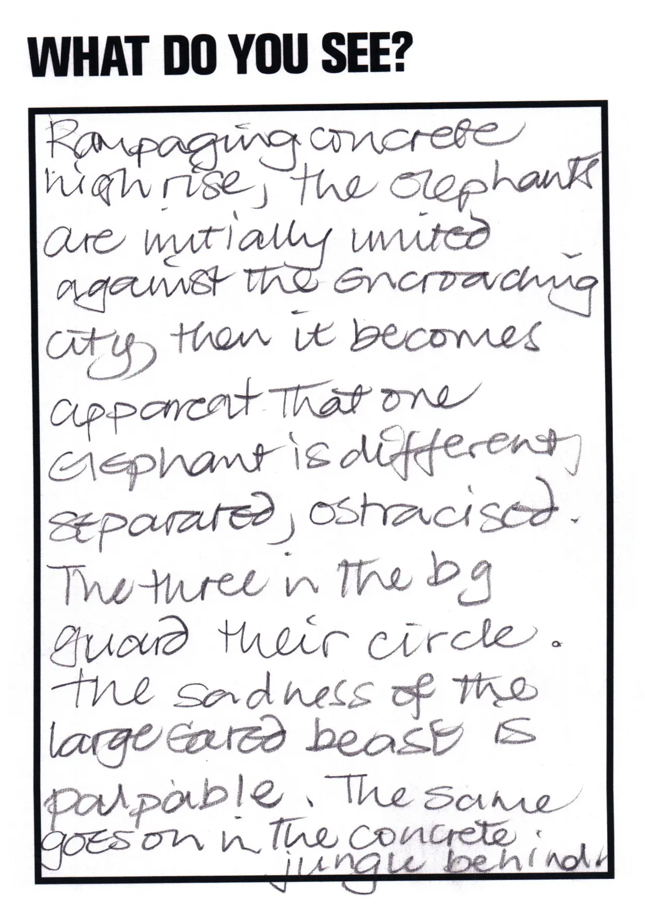 This photograph featured as part of the Touchstone programme (2012-2020). Each display consisted of a single photographic work on the Eranda studio floor where visitors were invited to respond to the question 'What do you see?' using the cards and pencils provided. A bench was placed in front of the work, encouraging people to spend a little longer than they might usually. The programme was part of a wider series of projects and activities related to visual literacy.