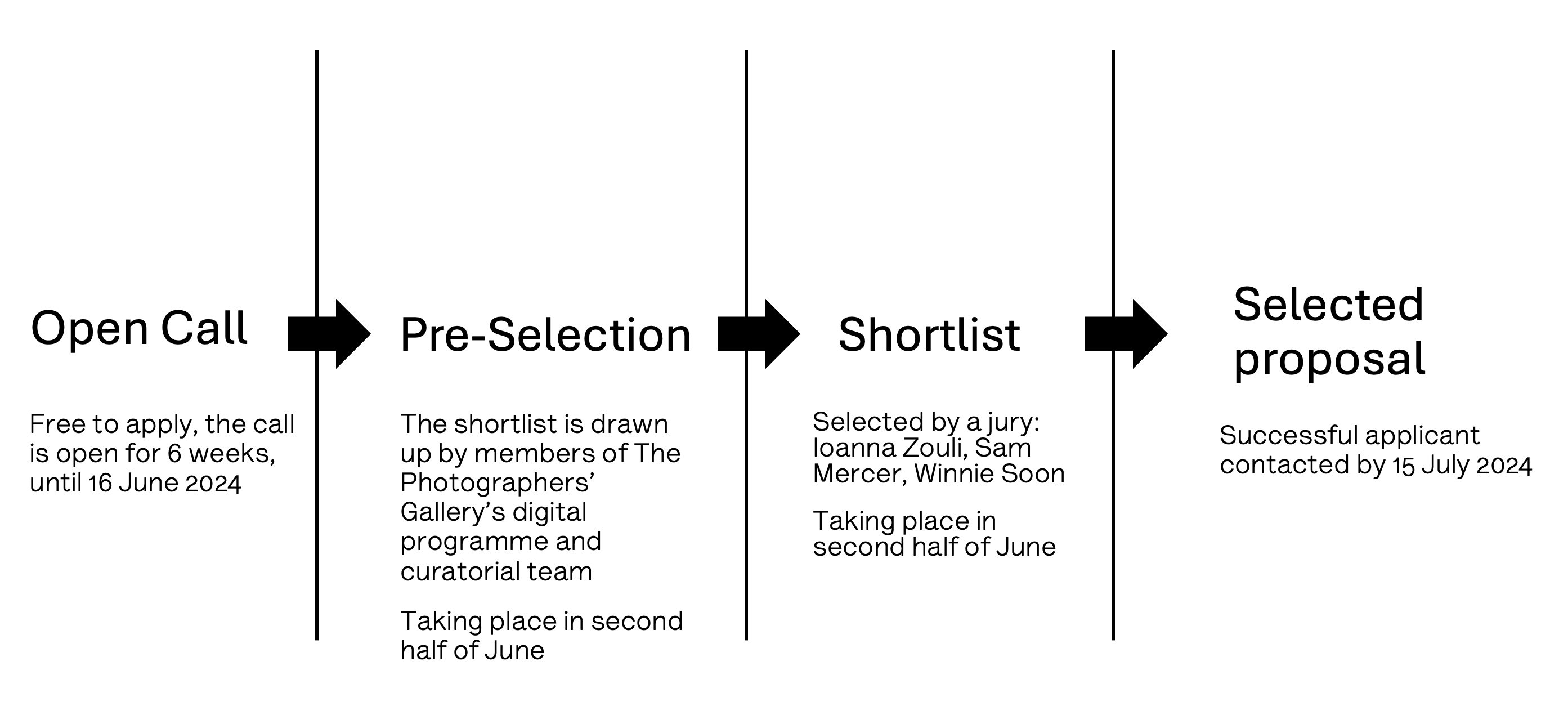 One work will be selected by a team of people including members of The Photographers’ Gallery digital programme, as well as an external invited selector. We are not conducting interviews, however if any questions arise during the shortlisting process about your proposal, we may be in touch.