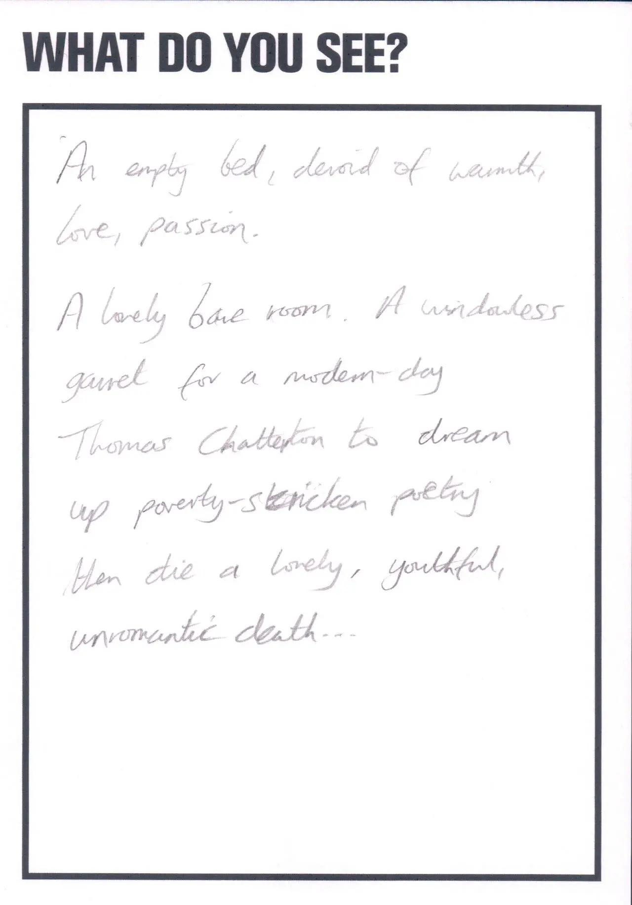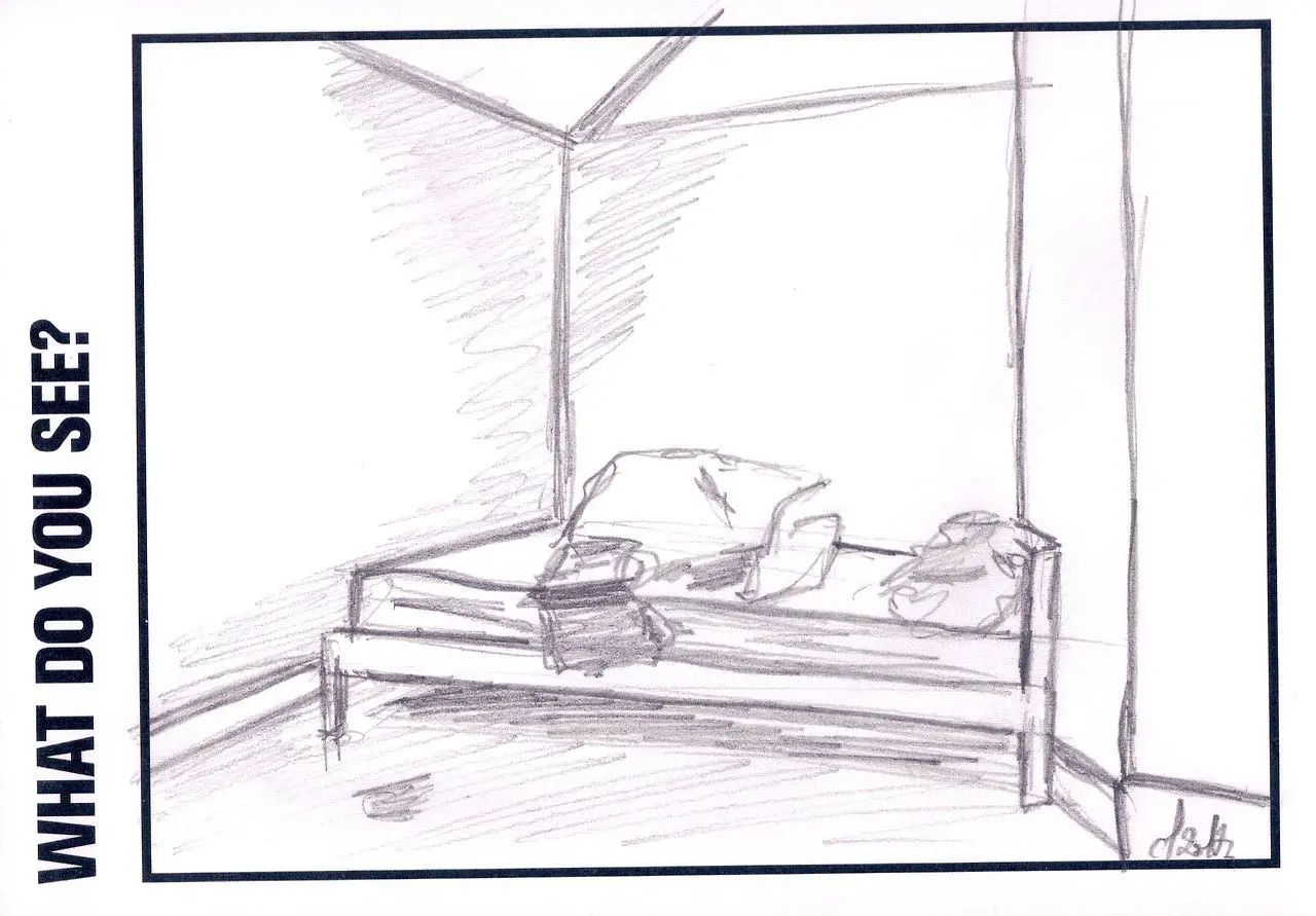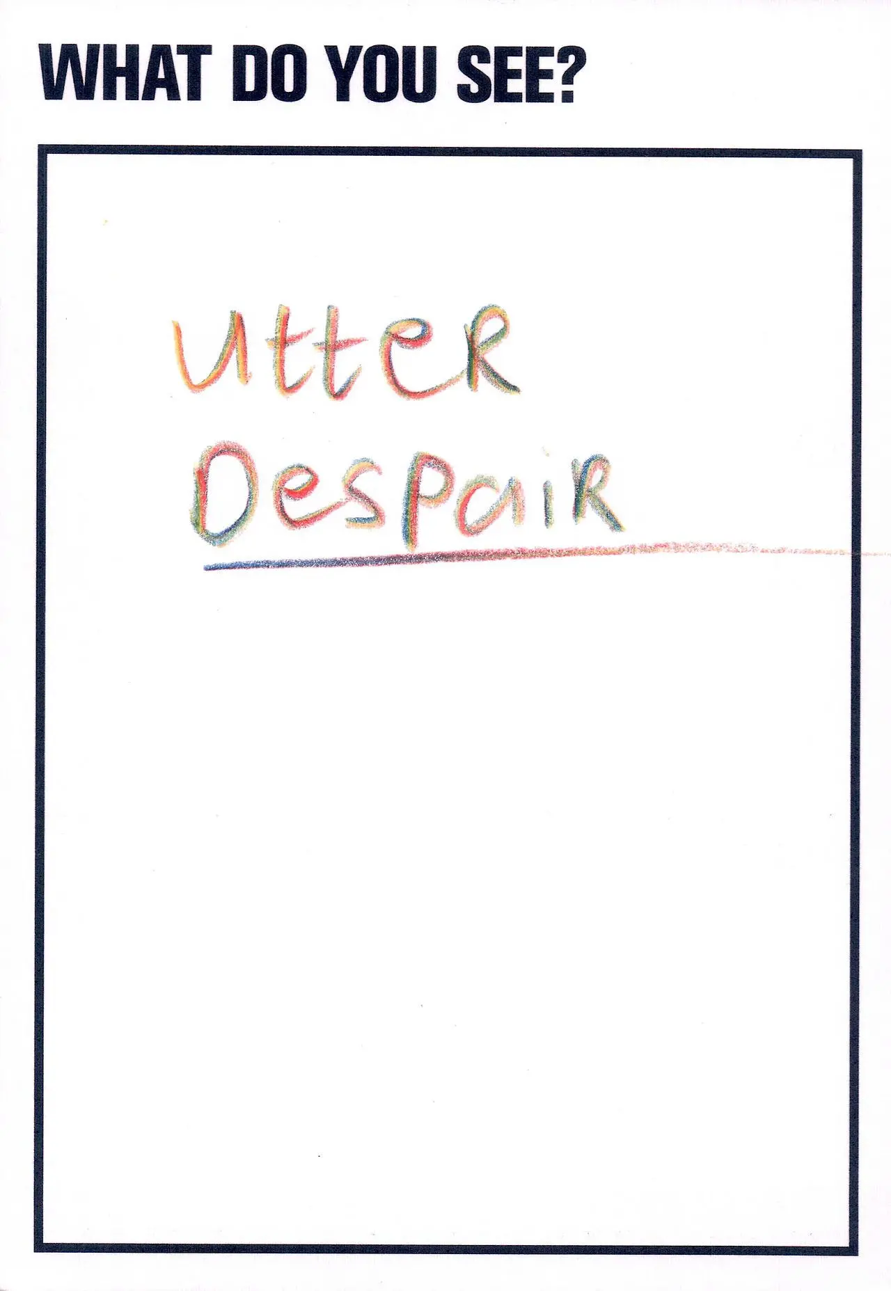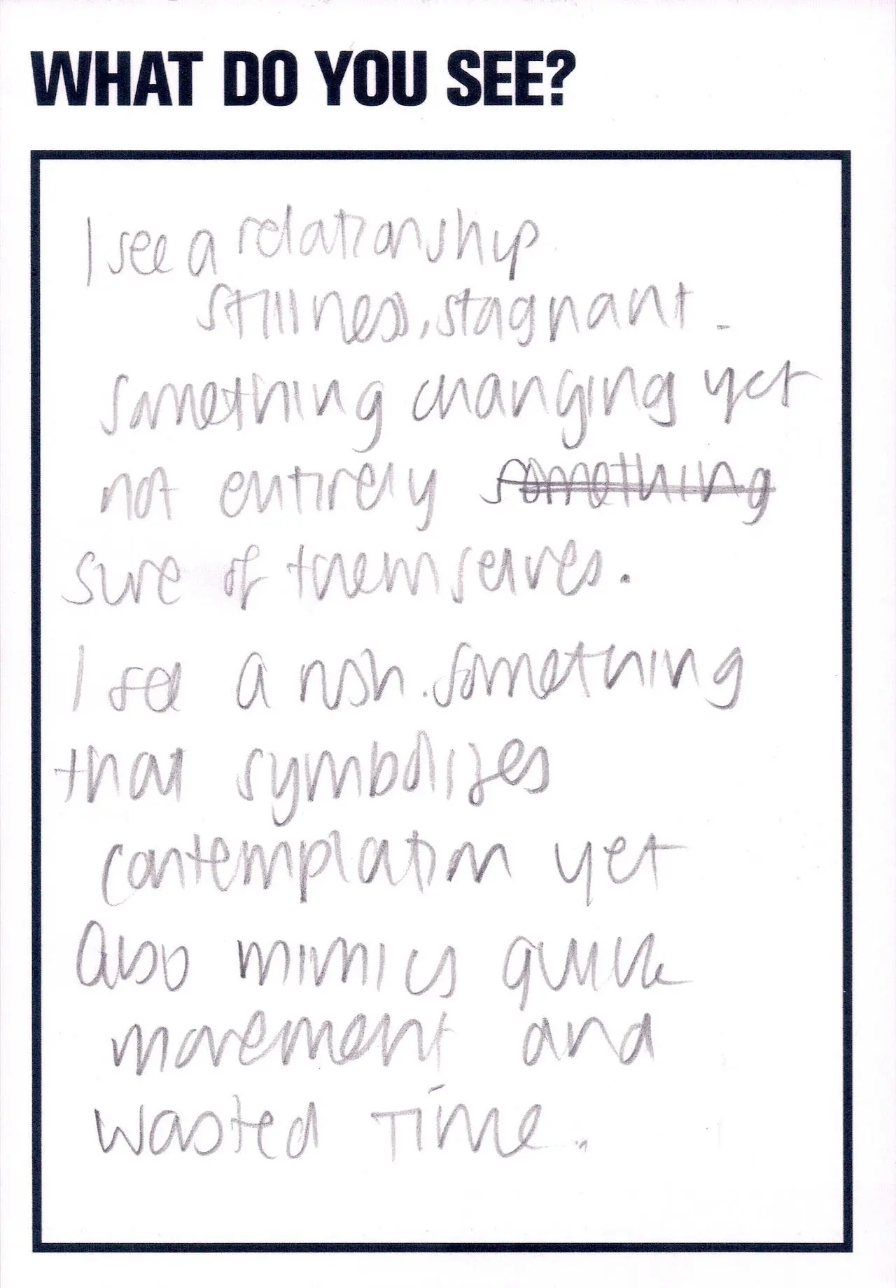 The photograph featured as part of the Touchstone programme (2012-2020). Each display consisted of a single photographic work on the Eranda studio floor where visitors were invited to respond to the question 'What do you see?' using the cards and pencils provided. A bench was placed in front of the work, encouraging people to spend a little longer than they might usually. The programme was part of a wider series of projects and activities related to visual literacy.