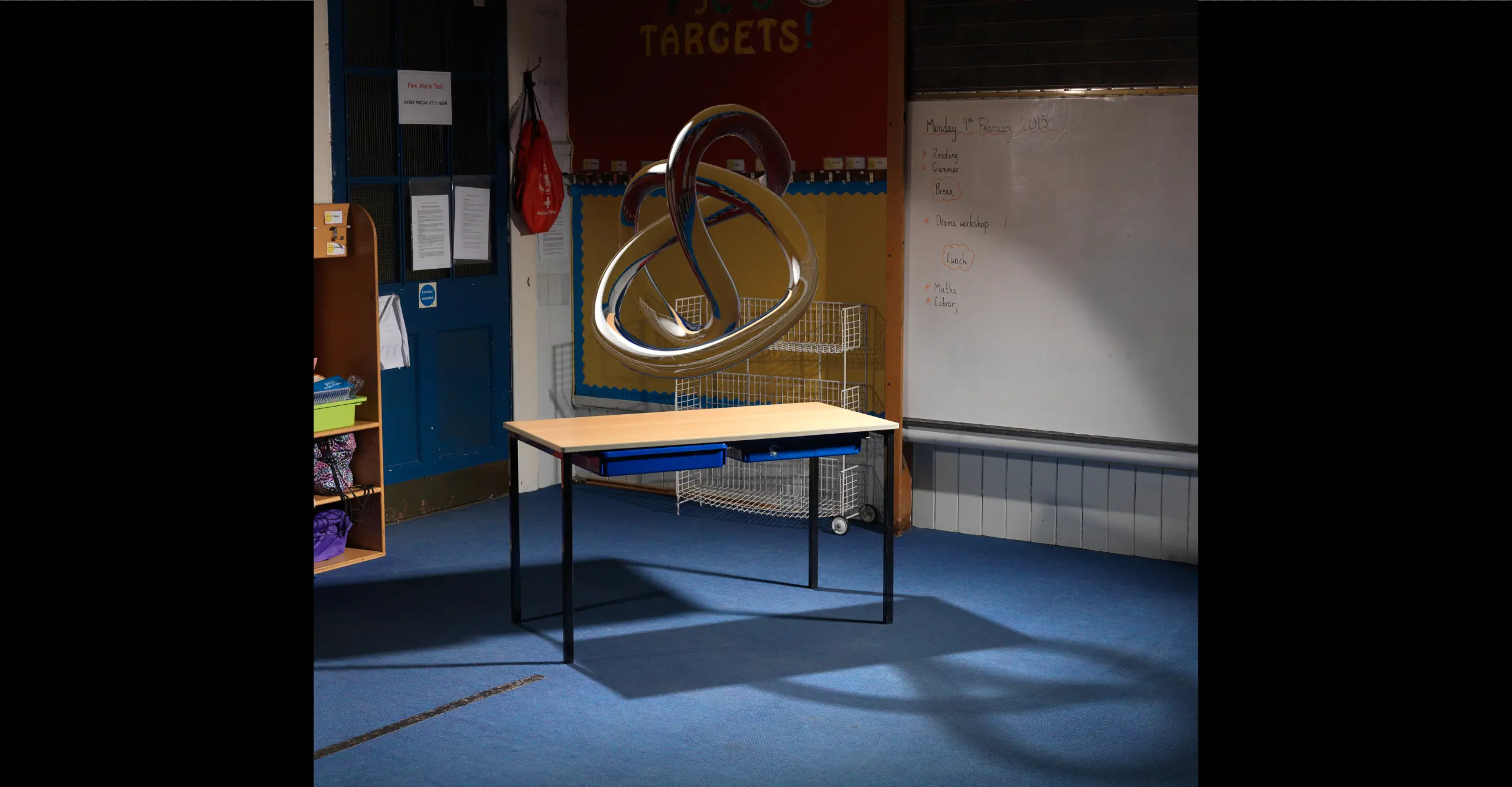 As these 3D objects hover above the desks, they enter the space of the classroom, casting shadows on the floor which mingle with those of the room. Combining still photography and animation, the project alludes to the co-existence and pervasive nature of these different spaces through which childhood is now experienced.
