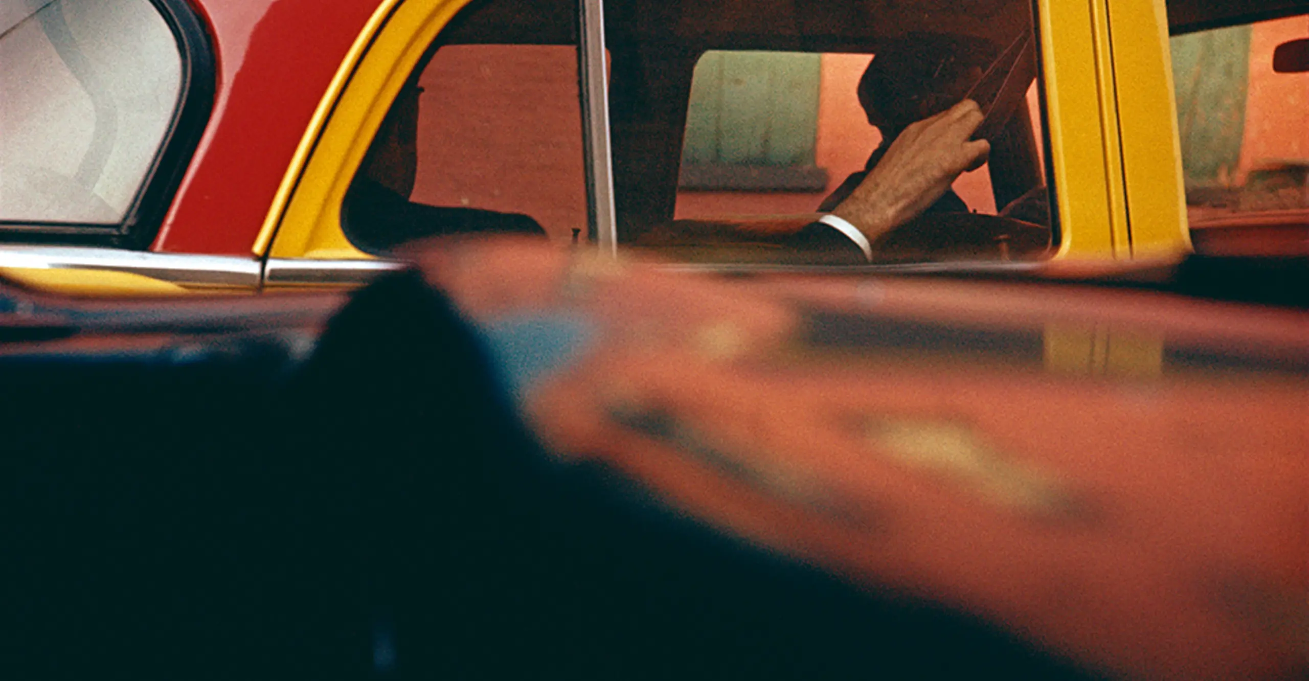The engaging composition and photo abstraction in Leiter's photograph entitled ‘Taxi’ 1957, is an example of Leiter’s unique perspectives that have made him one of the great pioneers of 20th-century photography. Leiter’s use of saturated colour instantly draws the viewer’s eye into his image. The passionate red tones against the shadows create contrast and a sense of warmth to his images and have similar traits to his paintings with expressionist qualities. When we look at the photograph for the first time we are instantly drawn into the upper right of the image, the mysterious hand that appears from inside the taxi and this is further emphasised through the use of his engaging depth of field. The figure is anonymous, we cannot see their face, however, we as viewers subconsciously ask ourselves questions about this figure, who they are and where they are going. It is this element to Leiter’s work that captures the viewer and draws them into the scene, placing us in this perspective, as we are one with the photograph.