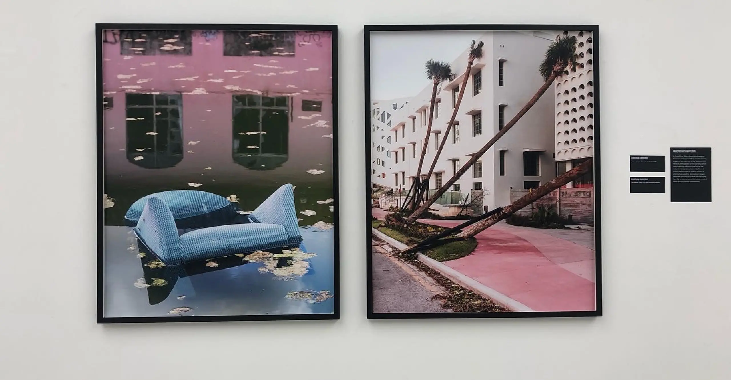 It was clear that the exhibition was carefully curated: not perfect chronological order, but arranged to provoke thought and feeling. Sheila Pree Bright’s captivating black and white photographs of Black Lives Matter protests were juxtaposed by Bruce Davidson’s photographs of the Selma March in 1965. It was as though photographs from recent years could have been taken in the ‘60s, in turn questioning the extent of change in racial justice. The images presented were powerful, and there are several that stick out; chilling images of the family of George Floyd at his funeral against an image of Trump’s rallies during the pandemic. The two photographs that stood out the most to me were Blue Velvet Chair, 2020, and Pink Sidewalk, Florida, 2017, by Anastasia Samoylova. An image of a blue chair floating in murky water with the reflection of a building was hung next to an image of a pink sidewalk where palm trees had toppled into the neighbouring buildings. These two images reflect upon the impact of rising sea levels in southern US states, and created a great sense of pictorial tension of the human created world and the natural environment.
