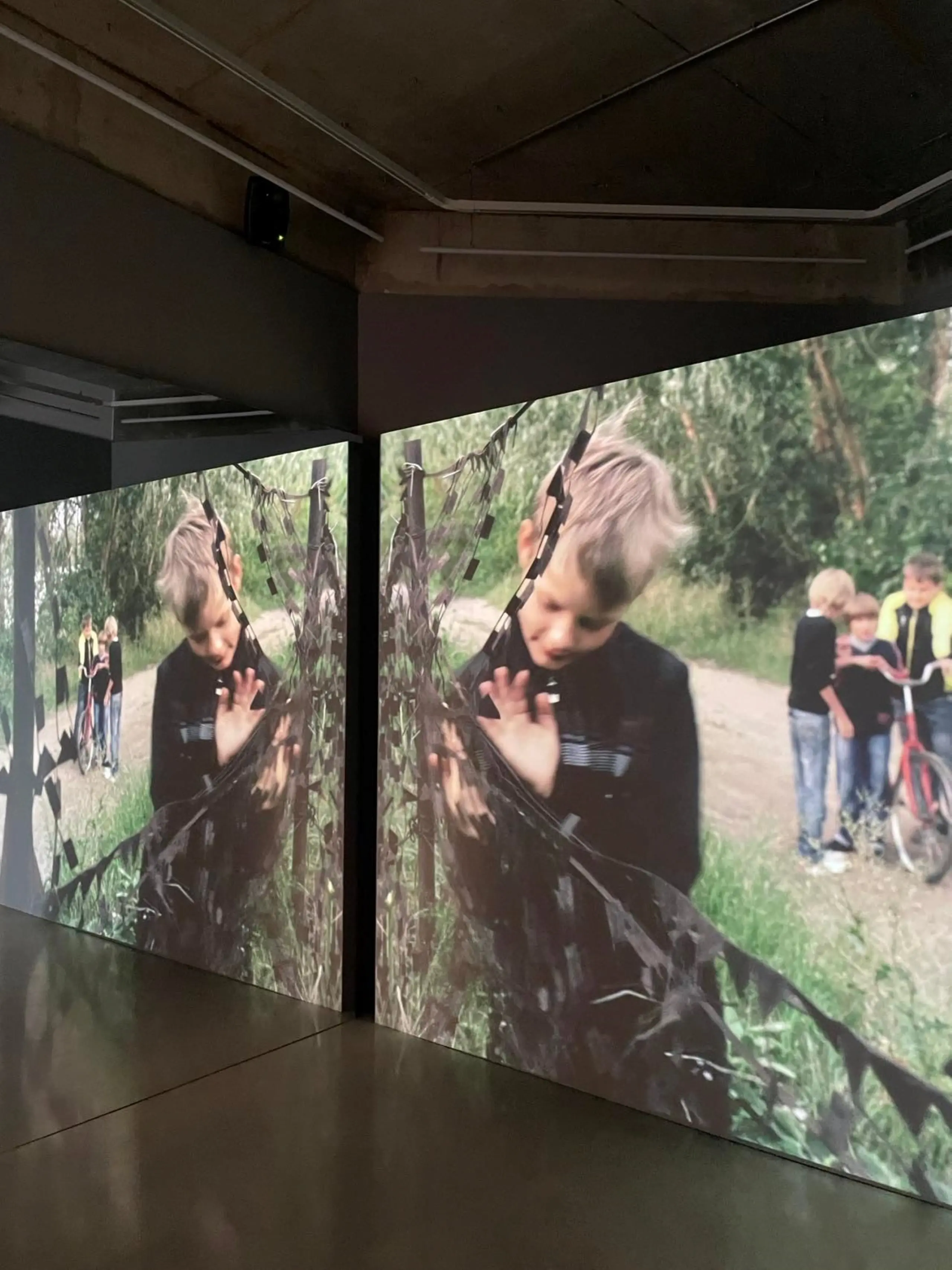 On entering the gallery, the sound of a Geiger counter – that scraping, insidious crackle – draws my curiosity to the film space. Adjacent to the screen are mirrored panels, displaying scenes of the Chernobyl exclusion zone – abandoned houses, factories, parks – replicating themselves beyond the frame. This elongating patchwork of environmental disaster relays, perhaps, how the creep of radiation evades any circumscription, all horizons; it’s as if the camera, contaminated by the nuclear past, spawns and spreads radioactivity in the present. This cancerous temporality, The Toxic Camera announces, is what killed Vladimir Shevchenko, the filmmaker who sought to document the events of the Chernobyl disaster. The irradiated, corrupted footage shot on Shevchenko’s camera embodied the very contagions that claimed the director’s life. This story, the experience of seeing and hearing it, is moving as it is acutely unsettling.
